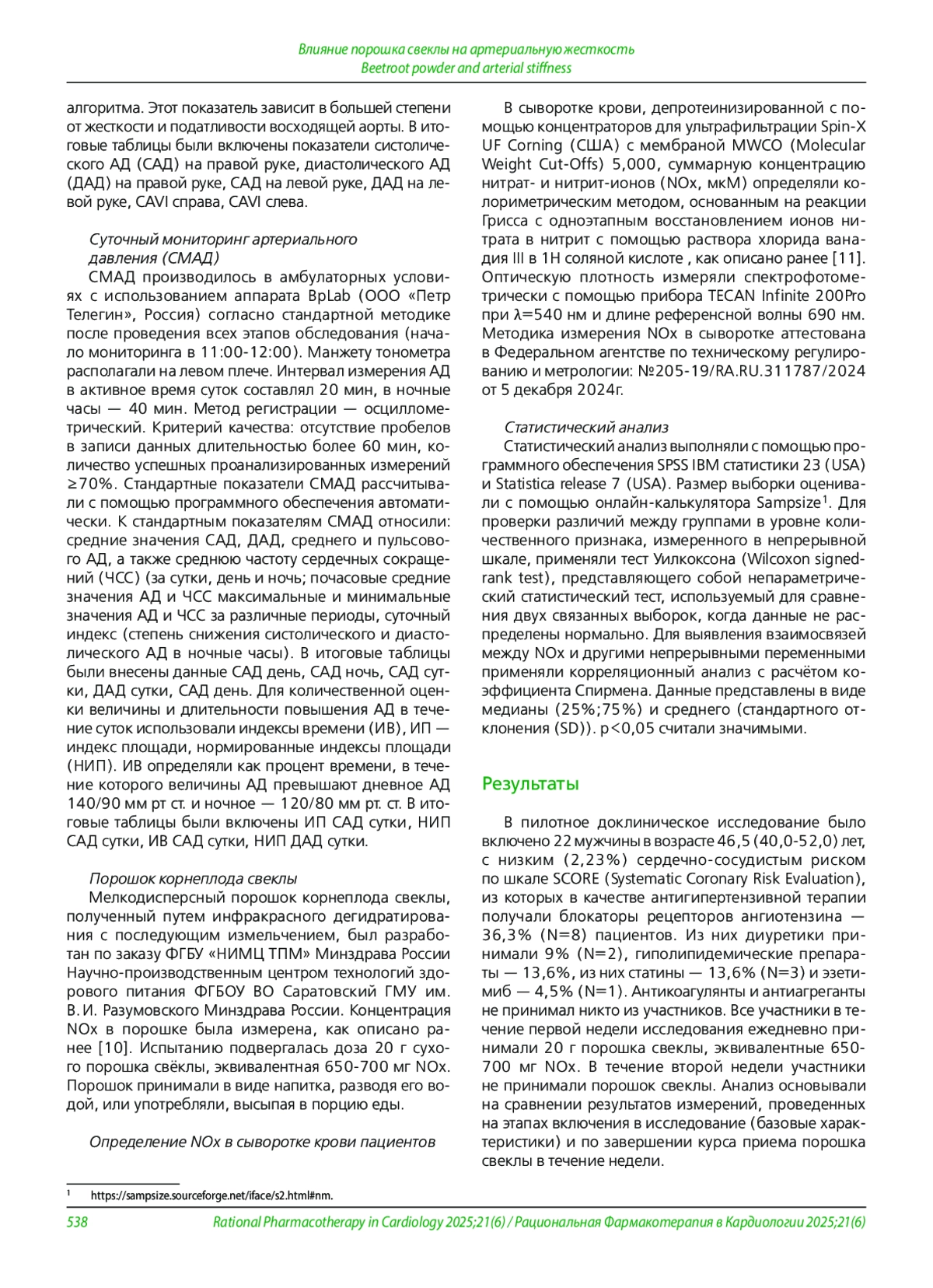 Материал и методы. В пилотное доклиническое исследование было включено 22 добровольца мужского пола (49±10 лет) с АГ. Участники принимали свекольный порошок «Beta-NO-БУСТ», разработанный по заказу ФГБУ «НИМЦ ТПМ» в дозе 20 г/день, эквивалентной 650-700 мг NOx перорально в течение недели дополнительно к терапии, если таковая была назначена. У участников проводили контроль АД путем СМАД, а также объемную сфигмографию, включающую измерение АД на 4-х конечностях с расчетом индекса CAVI (cardio-ankle vascular index) или сердечно-лодыжечного сосудистого индекса и лодыжечно-плечевого индекса до и после приема порошка свеклы. Проводилось взятие крови для анализа суммарной концентрации нитрат- и нитрит-ионов (NOx, мкМ) колориметрическим методом, основанным на реакции Грисса с одноэтапным восстановлением ионов нитрата в нитрит с помощью раствора хлорида ванадия III в 1Н соляной кислоте.