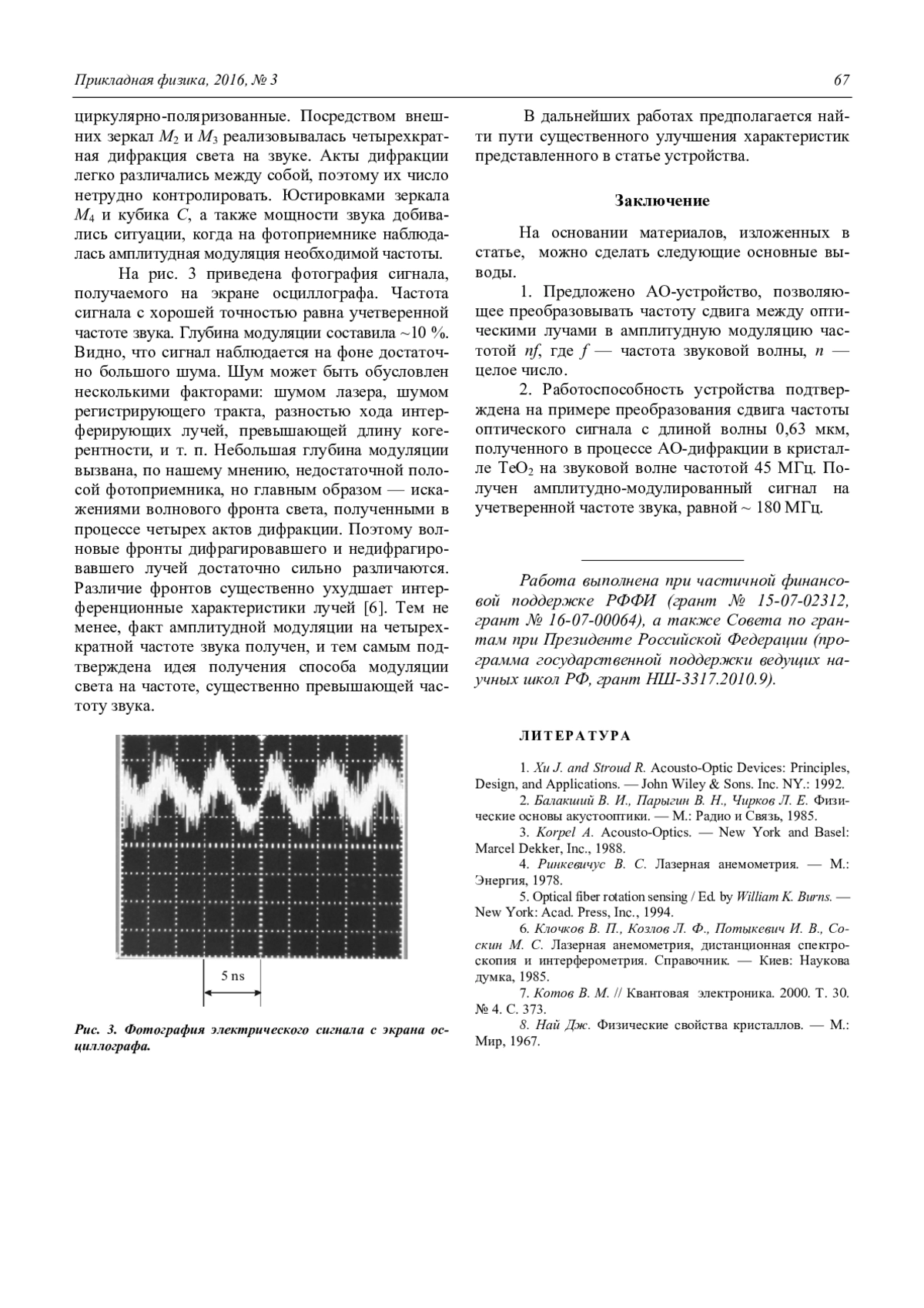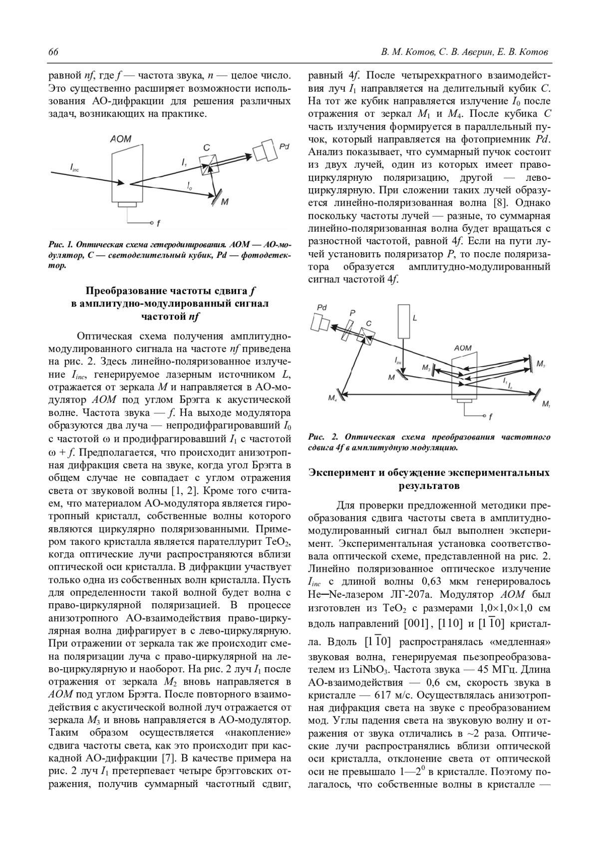 Котов В. М., Аверин С. В., Котов Е. В. Акустооптическое преобразование частотного сдвига оптического излучения в амплитудно-модулированный сигнал оптического излучения 65