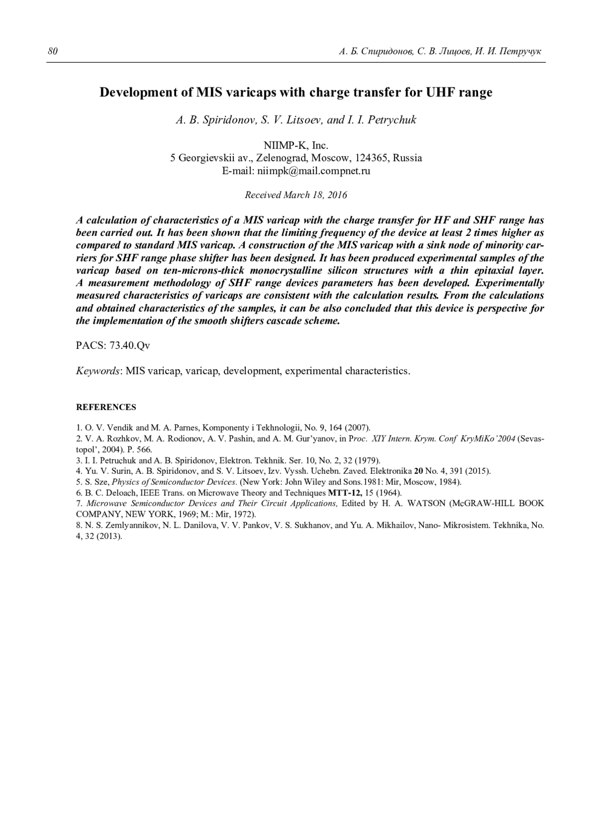 A. B. Spiridonov, S. V. Litsoev, and I. I. Petrychuk Development of MIS varicaps with charge transfer for UHF range 75