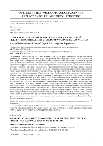 Объективный процесс глобализации, сущность которого заключается в стандартизации и унификации всех сфер жизни общества, распространяется и на сферу образования. В статье рассматриваются проблемы трансформации национальных систем образования. Анализируются проблемы развития национальных систем образования в связи с глобальными процессами стандартизации образования, применения цифровых технологий в процессе обучения, визуализации усвоения знаний, проблем идентификации учащихся в результате символизации современной мультикультурной образовательной среды. Показано, что в этих условиях возникает проблема сохранения культурной идентичности национальных образовательных систем. Особенно это касается процессов образования в многонациональных, поликультурных и многоконфессиональных обществах и странах. Глобализация образования ведет к сокращению объема гуманитарных знаний, реинтерпретации символов культуры в знаки, информатизации, смещающей ценностное отношение субъектов образования к признанию информации самой по себе фундаментальной ценностью. В статье рассматриваются направления сохранения культурной идентичности национальных образовательных систем как насущной задачи развития отечественной национальной системы образования. Отмечаются, что, с одной стороны, положительные тенденции решения этой проблемы связаны не только с освоением новых технологий, стандартов, приемов и инструментов обучения, но и с сохранением традиций национальной системы образования. Но, с другой стороны, именно сохранение национальных и культурных ценностей и национально-культурной идентификации учащихся в современных условиях глобализации становится важнейшим фактором и инструментом развития самой отечественной системы образования. Выделяются пять перспективных направлений сохранения идентичности национальных образовательных систем как ключевого фактора укрепления политического суверенитета Российской Федерации в настоящих условиях.