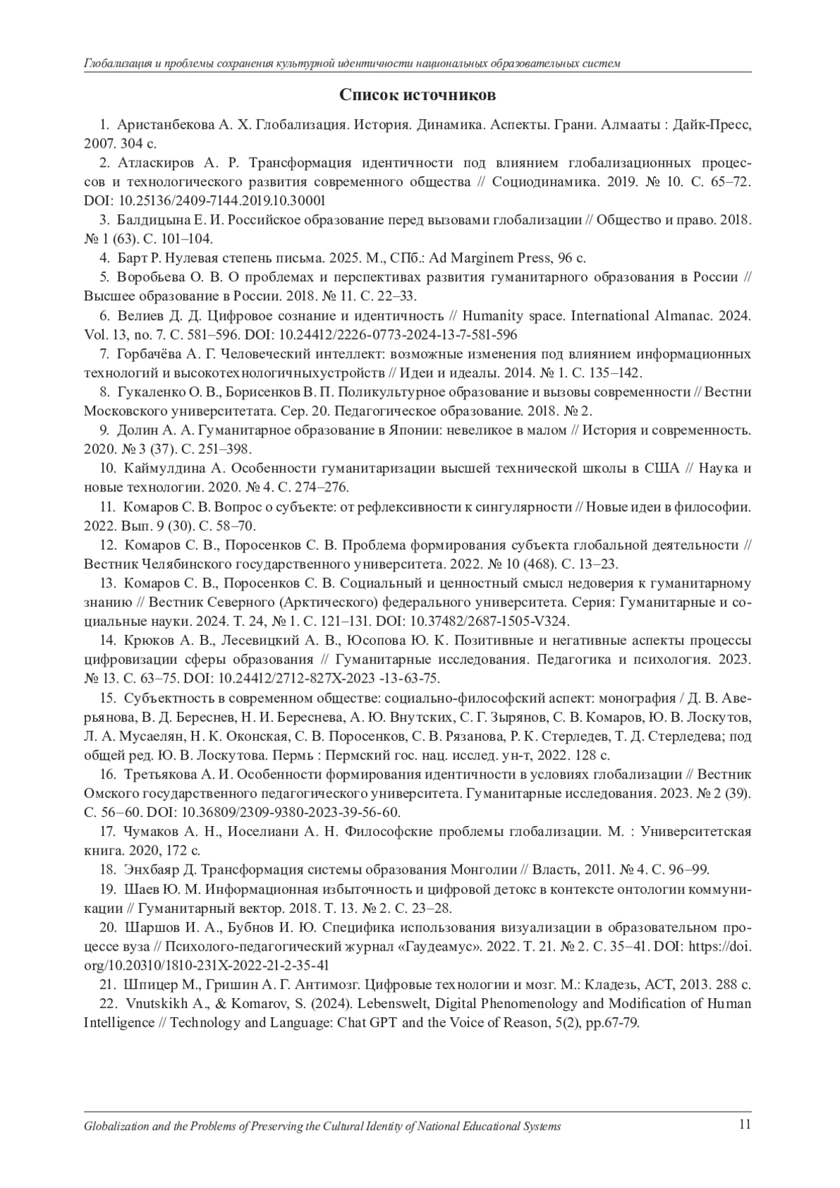 11. Комаров С. В. Вопрос о субъекте: от рефлексивности к сингулярности // Новые идеи в философии. 2022. Вып. 9 (30). С. 58-70. EDN: XCYPHA
