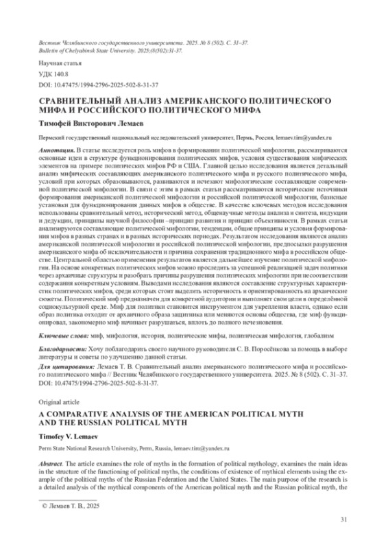В статье исследуется роль мифов в формировании политической мифологии, рассматриваются основные идеи в структуре функционирования политических мифов, условия существования мифических элементов на примере политических мифов РФ и США. Главной целью исследования является детальный анализ мифических составляющих американского политического мифа и русского политического мифа, условий при которых образовываются, развиваются и исчезают мифологические составляющие современной политической мифологии. В связи с этим в рамках статьи рассматриваются исторические источники формирования американской политической мифологии и российской политической мифологии, базисные установки для функционирования данных мифов в обществе. В качестве ключевых методов исследования использованы сравнительный метод, исторический метод, общенаучные методы анализа и синтеза, индукции и дедукции, принципы научной философии - принцип развития и принцип объективности. В рамках статьи анализируются составляющие политической мифологии, тенденции, общие принципы и условия формирования мифов в разных странах и в разных исторических периодах. Результатом исследования являются анализ американской политической мифологии и российской политической мифологии, предпосылки разрушения американского мифа об исключительности и причина сохранения традиционного мифа в российском обществе. Центральной областью применения результатов является дальнейшее изучение политической мифологии. На основе конкретных политических мифов можно проследить за успешной реализацией задач политики через архаичные структуры и разобрать причины разрушения политических мифологии при несоответствии содержания конкретным условиям. Выводами исследования являются составление структурных характеристик политических мифов, среди которых стоит выделить историчность и ориентированность на архаические сюжеты. Политический миф предназначен для конкретной аудитории и выполняет свои цели в определённой социокультурной среде. Миф для политики становится инструментом для укрепления власти, однако если образ политика отходит от архаичного образа защитника или меняются основы общества, где миф функционировал, закономерно миф начинает разрушаться, вплоть до полного исчезновения.