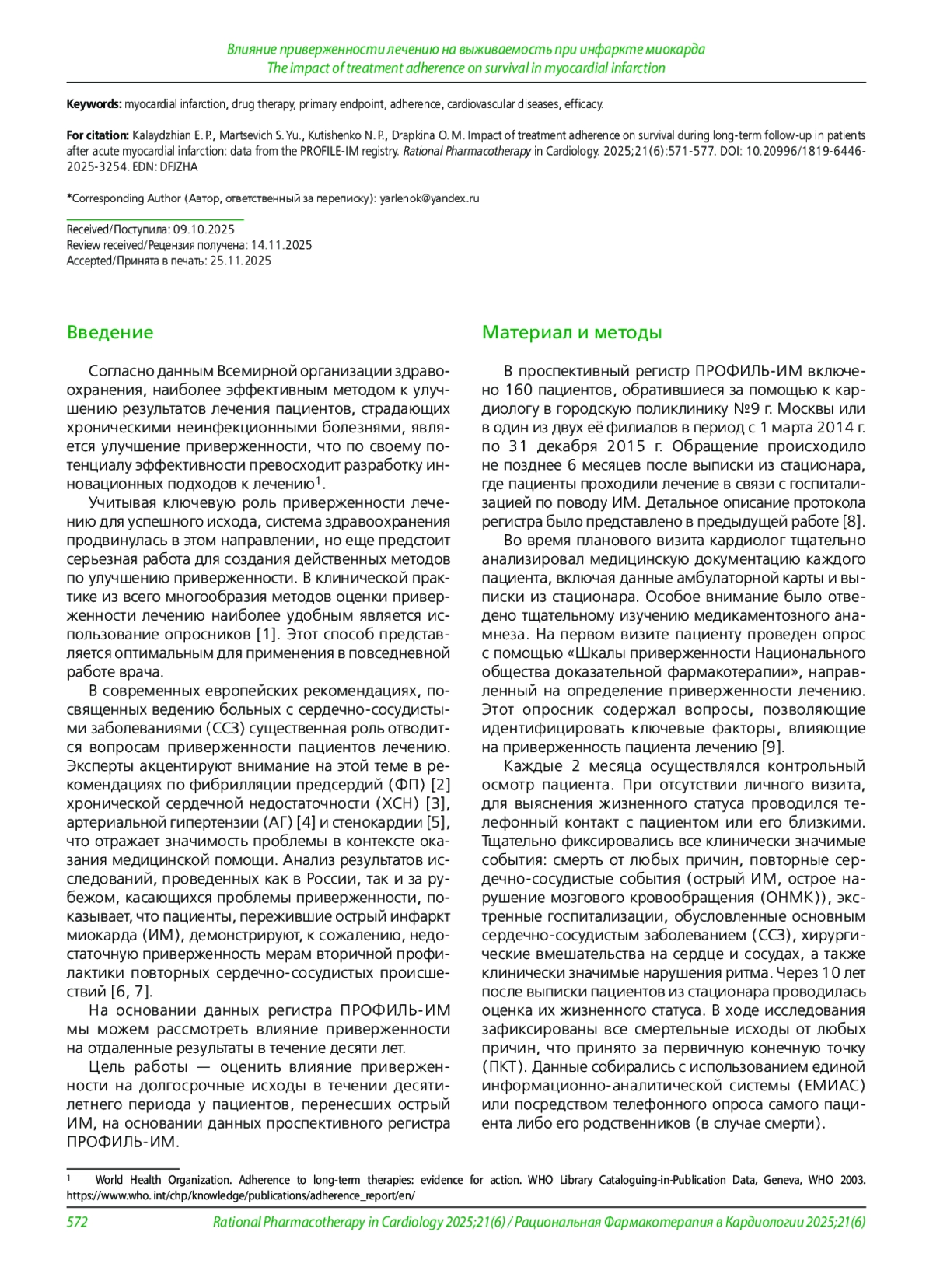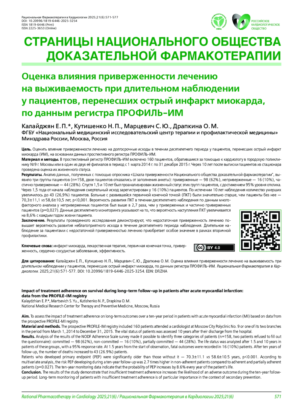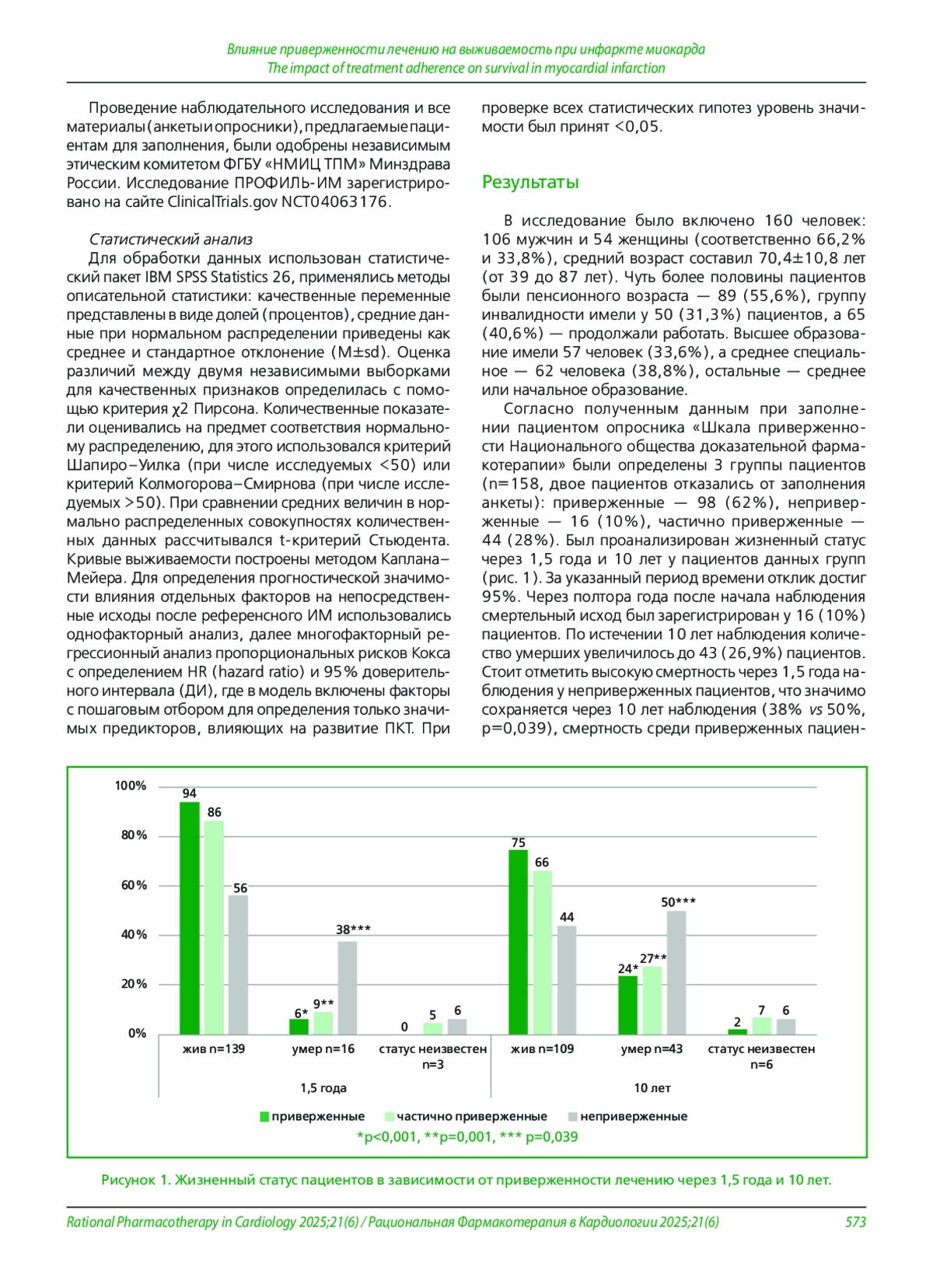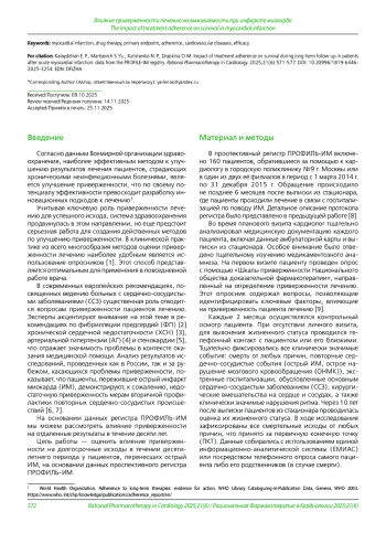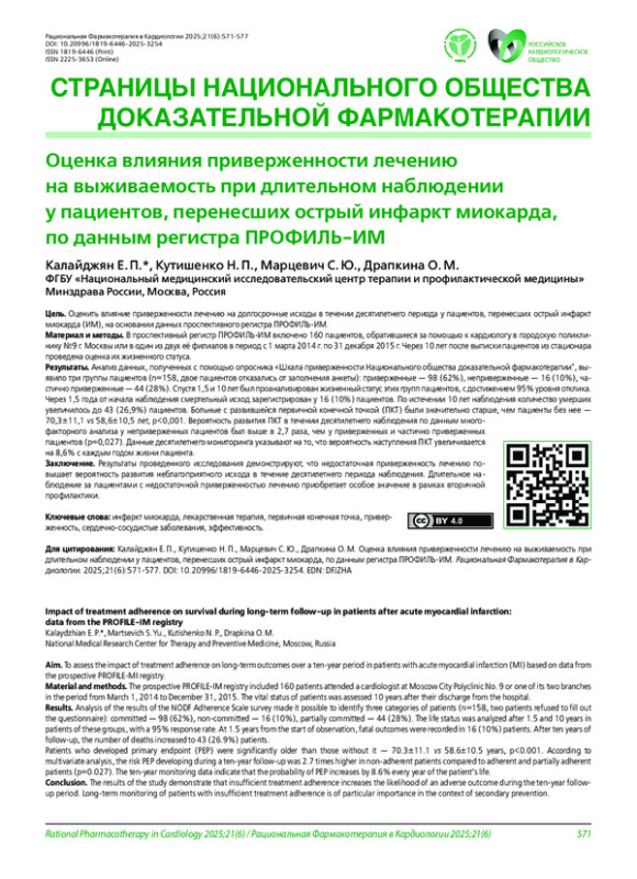 Цель. Оценить влияние приверженности лечению на долгосрочные исходы в течении десятилетнего периода у пациентов, перенесших острый инфаркт миокарда (ИМ), на основании данных проспективного регистра ПРОФИЛЬ-ИМ.