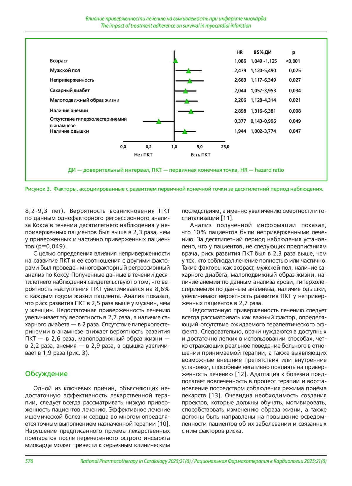 Заключение. Результаты проведенного исследования демонстрируют, что недостаточная приверженность лечению повышает вероятность развития неблагоприятного исхода в течение десятилетнего периода наблюдения. Длительное наблюдение за пациентами с недостаточной приверженностью лечению приобретает особое значение в рамках вторичной профилактики.
