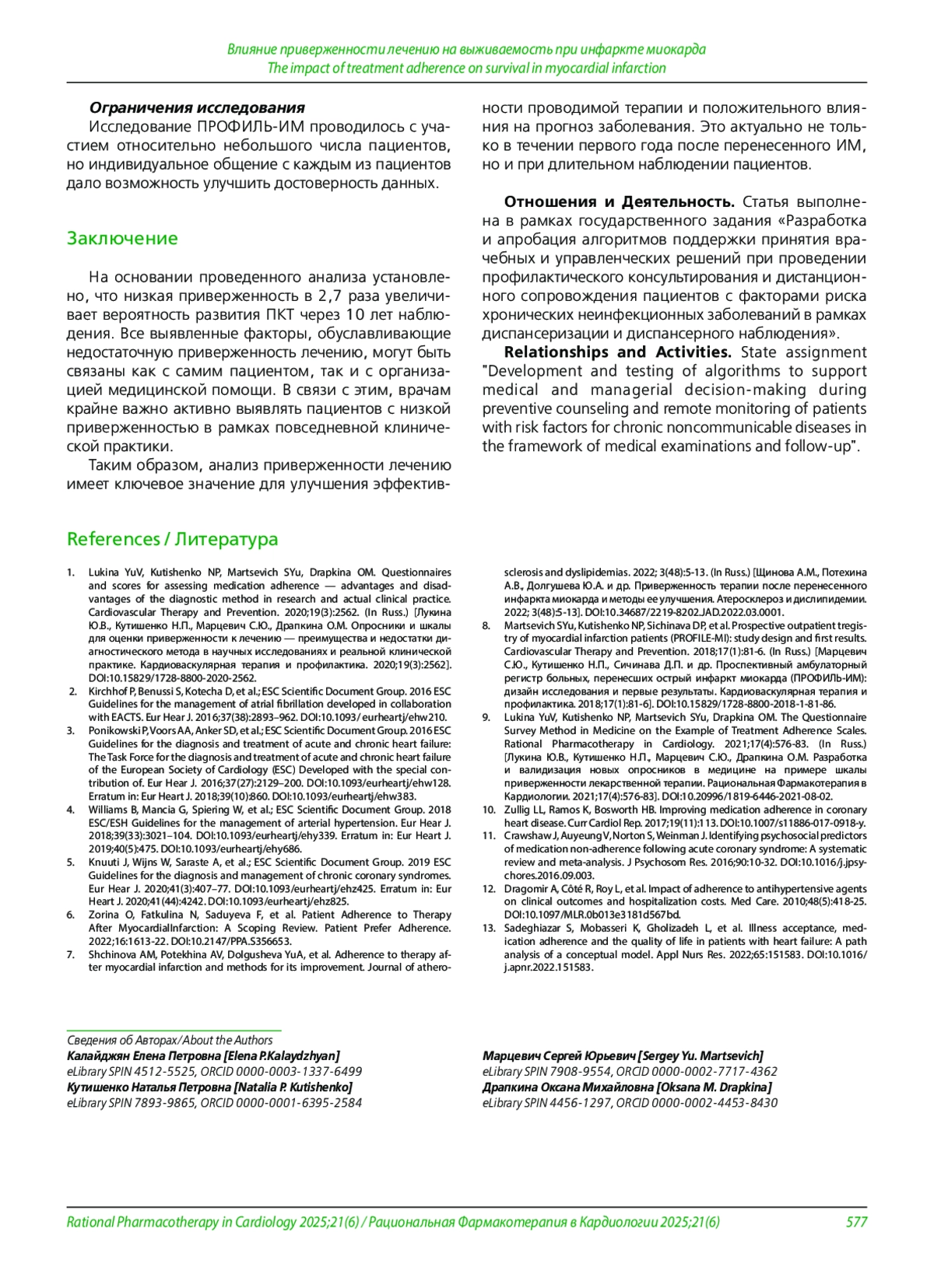 7. Щинова А.М., Потехина А.В., Долгушева Ю.А. и др. Приверженность терапии после перенесенного инфаркта миокарда и методы ее улучшения. Атеросклероз и дислипидемии. 2022; 3(48):5-13. DOI: 10.34687/2219-8202.JAD.2022.03.0001