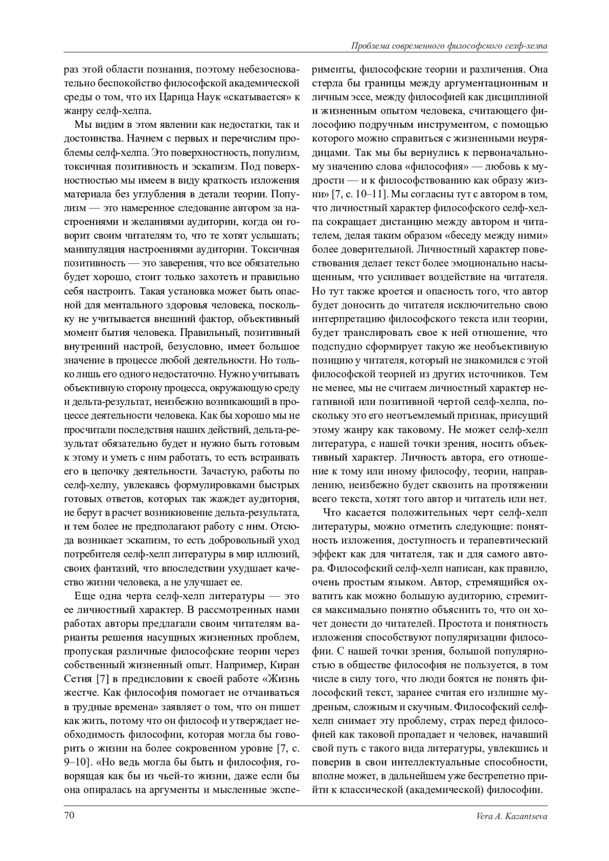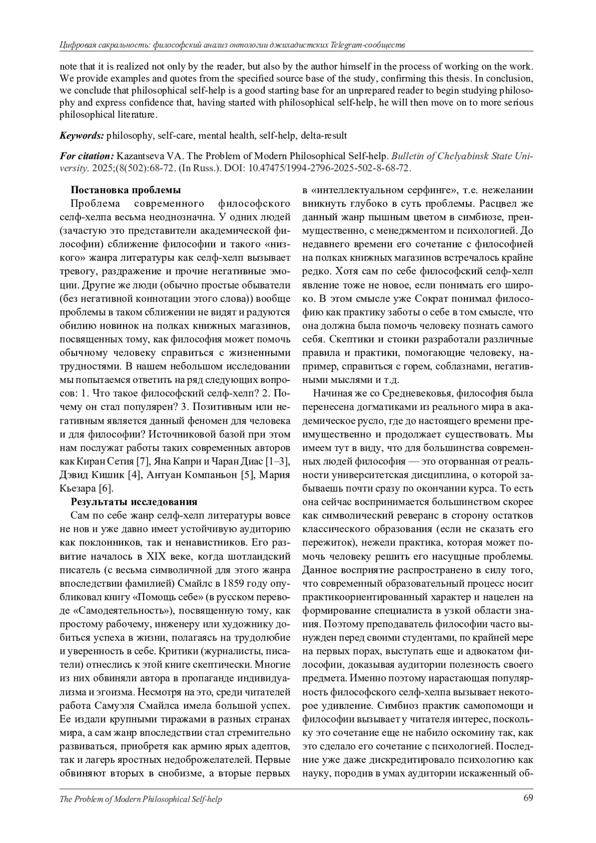 В статье рассматривается проблема философского селф-хелпа. Данная проблема является актуальной в силу того, что этот литературный жанр набирает в настоящее время популярность. Академическое же философское сообщество беспокоится о дискредитации философии как области познания этим жанром, поскольку так уже произошло ранее с менеджментом и психологией. Под философским селф-хелпом мы понимаем симбиоз практик самопомощи и психологии; литературный жанр, в котором, опираясь на философские теории, концепции и категории и используя свой жизненный опыт, автор дает советы читателю о том, как решить насущные проблемы, справиться с жизненными трудностями. У философского селф-хелпа есть свои достоинства и недостатки. Среди его недостатков мы выделяем и описываем поверхностность, популизм, токсичную позитивность и эскапизм. В качестве достоинств мы называем и охарактеризовываем понятность изложения, доступность и терапевтический характер. Так же мы отдельно выделяем личностный характер данного жанра как такого, не относя эту его черту к достоинствам или недостаткам. Говоря о терапевтическом характере селф-хелпа мы отмечаем, что это главная черта такого рода литературы и с ее помощью реализуется утешающая функция философии в современном обществе, что очень важно, потому что таким образом философия может конкурировать в борьбе за умы с научным и религиозным формами познания мира. Говоря о терапевтическом эффекте философского селф-хелпа, мы отмечаем, что реализуется он не только читателем, но и самим автором в процессе работы над произведением. Нами приводятся примеры и цитаты из указанной источниковой базы исследования, подтверждающие данный тезис. В заключении мы делаем вывод о том, что философский селф-хелп является хорошей стартовой базой для начала изучения философии неподготовленным читателем и выражаем уверенность в том, что, начав с философского селф-хелпа, далее он перейдет к более серьезной философской литературе.