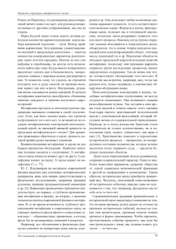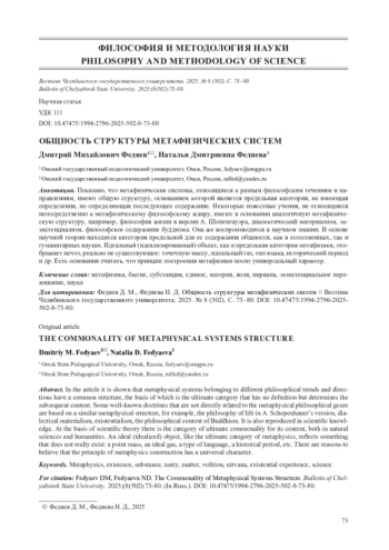 Показано, что метафизические системы, относящиеся к разным философским течениям и направлениям, имеют общую структуру, основанием которой является предельная категория, не имеющая определения, но определяющая последующее содержание. Некоторые известные учения, не относящиеся непосредственно к метафизическому философскому жанру, имеют в основании аналогичную метафизическую структуру, например, философия жизни в версии А. Шопенгауэра, диалектический материализм, экзистенциализм, философское содержание буддизма. Она же воспроизводится в научном знании. В основе научной теории находится категория предельной для ее содержания общности, как в естественных, так и гуманитарных науках. Идеальный (идеализированный) объект, как и предельная категория метафизики, отображает нечто, реально не существующее: точечную массу, идеальный газ, тип языка, исторический период и др. Есть основания считать, что принцип построения метафизики носит универсальный характер.