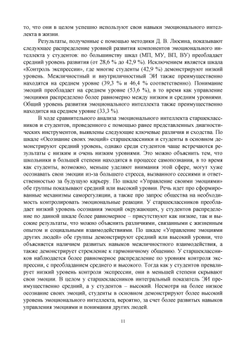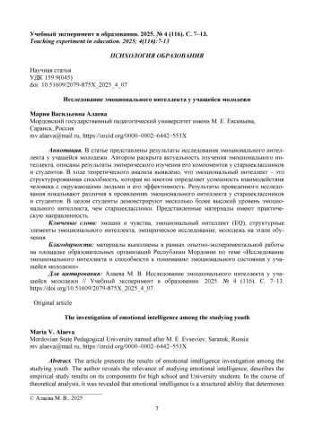 В статье представлены результаты исследования эмоционального интеллекта у учащейся молодежи. Автором раскрыта актуальность изучения эмоционального интеллекта, описаны результаты эмпирического изучения его компонентов у старшеклассников и студентов. В ходе теоретического анализа выявлено, что эмоциональный интеллект - это структурированная способность, которая во многом определяет успешность взаимодействия человека с окружающими людьми и его эффективность. Результаты проведенного исследования показывают различия в проявлениях эмоционального интеллекта у старшеклассников и студентов. В целом студенты демонстрируют несколько более высокий уровень эмоционального интеллекта, чем старшеклассники. Представленные материалы имеют практическую направленность.