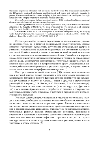 5. Никитина О. А., Никитина А. Р. Эмоциональный интеллект: понятие, структура, генезис // Психология и педагогика служебной деятельности. 2024. № 3. С. 58-63. EDN: JQSSQS