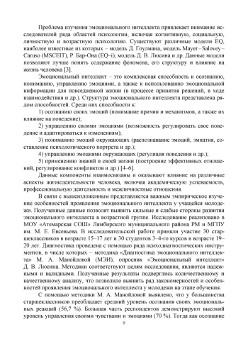 6. Плотникова Е. С. Эмоциональный интеллект как фактор эмоционального развития у юношей и девушек // Вестник Приамурского государственного университета им. Шолом-Алейхема. 2022. № 4 (49). С. 88-94.