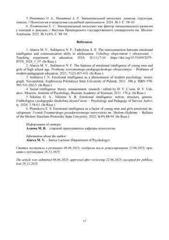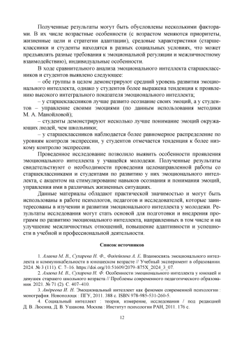 2. Алаева М. В., Сухарева Н. Ф. Особенности эмоционального интеллекта у юношей и девушек старшего школьного возраста // Проблемы современного педагогического образования. 2021. № 71 (2). С. 407-410. EDN: EUMVAA