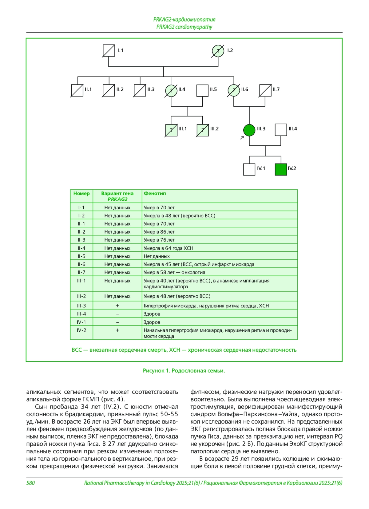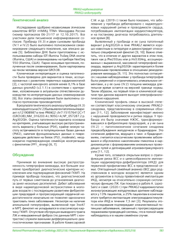 В статье представлен клинический случай семейной PRKAG2-кардиомиопатии, иллюстрирующий диагностические трудности и важность молекулярно-генетической верификации. Проведено комплексное клинико-инструментальное обследование пробанда и его ближайших родственников, а также полноэкзомное секвенирование. У пробанда с отягощенным анамнезом по внезапной сердечной смерти выявлена апикальная гипертрофия левого желудочка, наджелудочковая экстрасистолия и фибрилляция предсердий в анамнезе. У ее младшего сына зарегистрированы синдром предвозбуждения желудочков, брадикардия и синкопальные состояния. Генетический анализ идентифицировал у пробанда и младшего сына гетерозиготный патогенный вариант c.905G>A (p. Arg302Gln; rs121908987) в гене PRKAG2. Описанный случай подчеркивает, что PRKAG2-кардиомиопатия, ассоциированная с вариантом p. Arg302Gln, может характеризоваться умеренной гипертрофией миокарда, в то время как электрофизиологические нарушения (предвозбуждение, брадиаритмия) и отягощенный семейный анамнез по внезапной смерти выступают на первый план. Таким образом, сочетание нарушений ритма и проводимости сердца (особенно синдрома предвозбуждения желудочков) с невыраженной гипертрофией и семейными случаями внезапной смерти формирует характерный «красный флаг» для данного заболевания. Наличие подобной комбинации признаков в семейном анамнезе требует целенаправленного генетического тестирования для верификации диагноза и корректной стратификации риска.