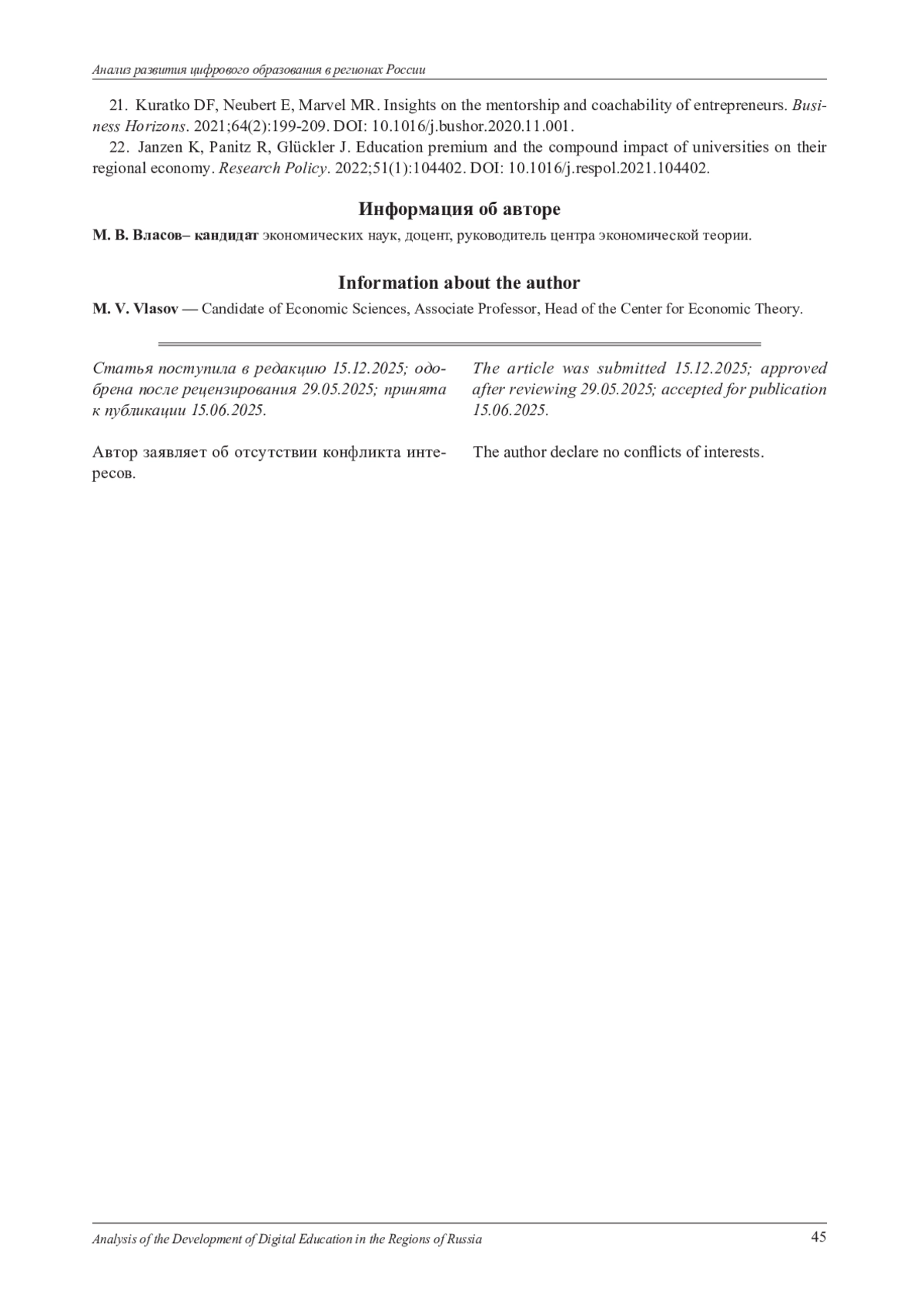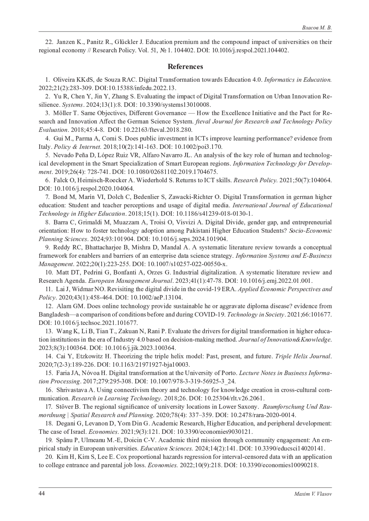 22. Janzen K., Panitz R., Gluckler J. Education premium and the compound impact of universities on their regional economy // Research Policy. Vol. 51, № 1. 104402. DOI: 10.1016/j.respol.2021.104402