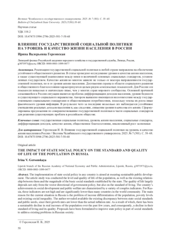 Реализация государственной социальной политики в любой стране направлена на обеспечение устойчивого общественного развития. В статье проведено исследование уровня и качества жизни населения, а также существующей взаимосвязи между ними и величиной основных социальных стандартов, установленных государством. Качество жизни во многом зависит не только от вектора направленности государственной политики, но и от уровня жизни населения. Достижения страны в области социального развития и общественного благосостояния характеризуются целым рядом комплексных показателей. Для России эти показатели невысоки и значительно ниже, чем у многих стран мирового сообщества. Основной причиной сложившейся в России ситуации является проблема дифференциации доходов населения, уровня бедности и существующего социального неравенства. Автором выявлено имеющееся несоответствие между государственными социальными стандартами и общественными потребностями, поскольку темпы их роста ниже фактического уровня инфляции. В результате чего за последние несколько лет наблюдается устойчивое уменьшение реальных доходов населения и, как следствие, снижение уровня и качества его жизни. Сформулированы предложения по совершенствованию государственной политики в части социальных стандартов для решения существующих проблем в российском обществе.