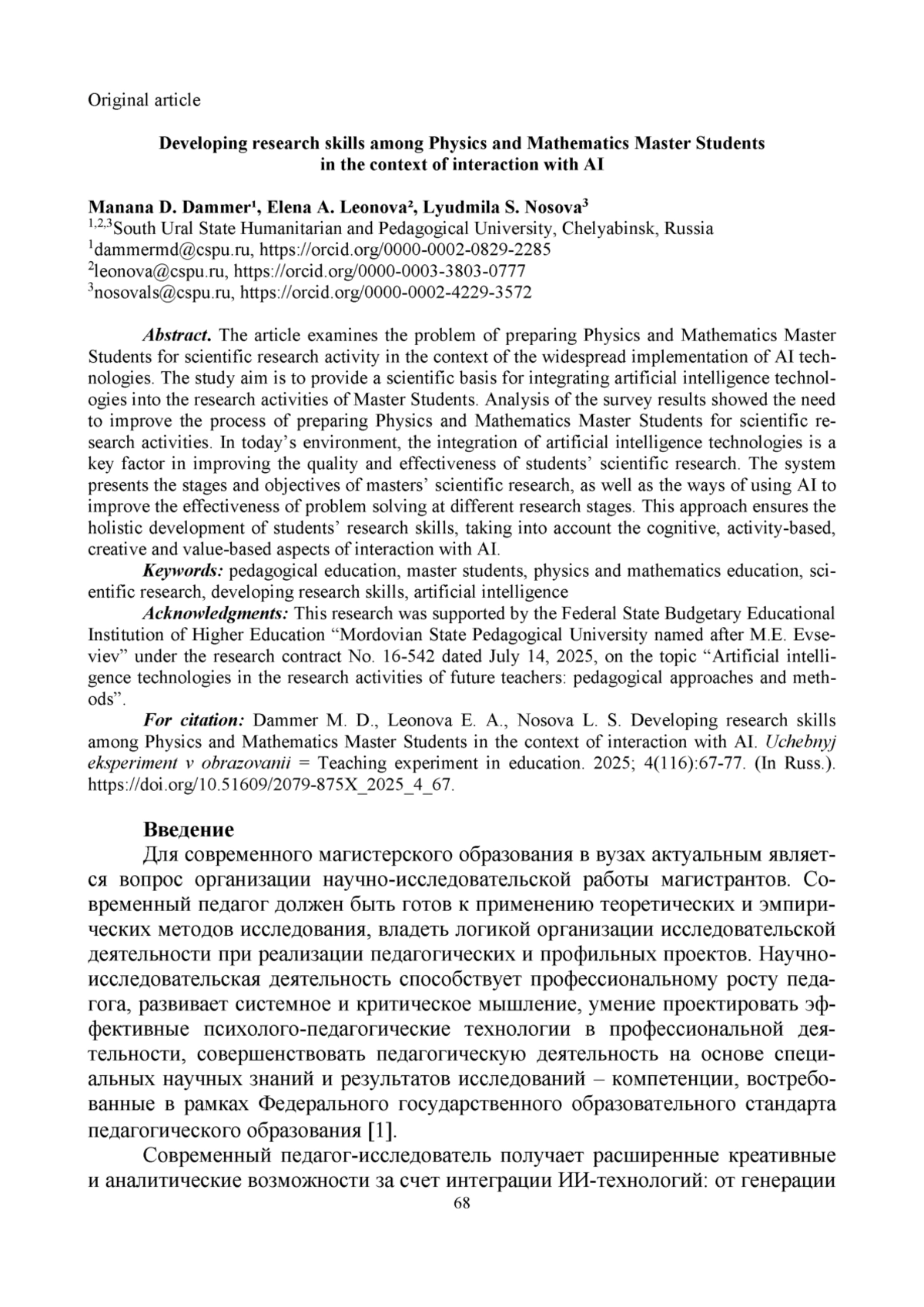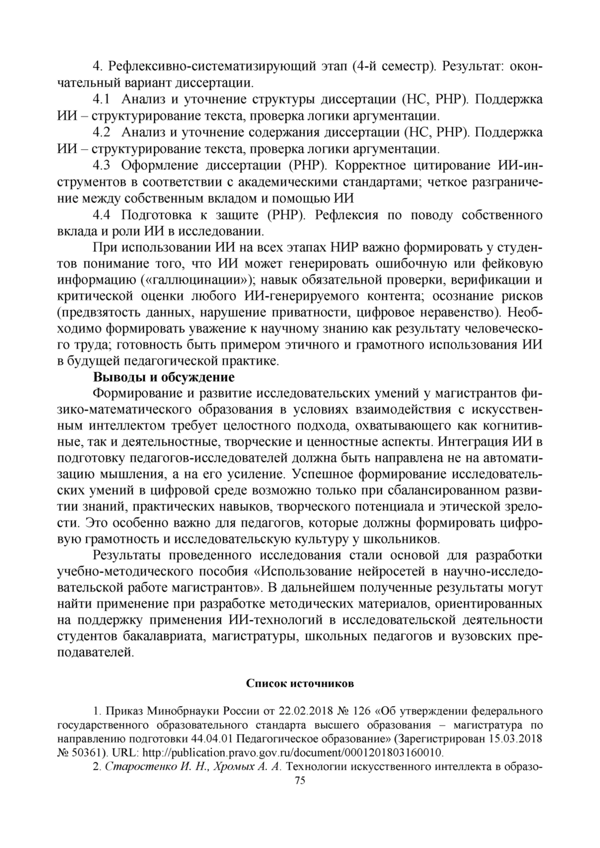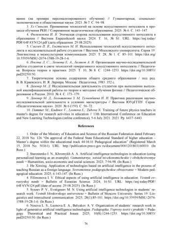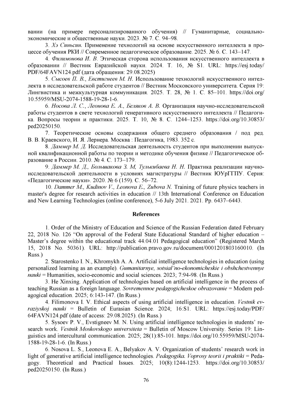 6. Носова Л. С., Леонова Е. А., Беляков А. В. Организация научно-исследовательской работы студентов в свете технологий генеративного искусственного интеллекта // Педагогика. Вопросы теории и практики. 2025. Т. 10, № 8. С. 1244-1253. DOI: 10.30853/ped20250150 EDN: KFGRTL