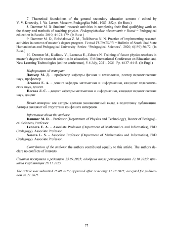 10. Dammer M., Kudinov V., Leonova E., Zubova N. Training of future physics teachers in master’s degree for research activities in education // 13th International Conference on Education and New Learning Technologies (online conference), 5-6 July 2021. 2021. Pp. 6437-6443.