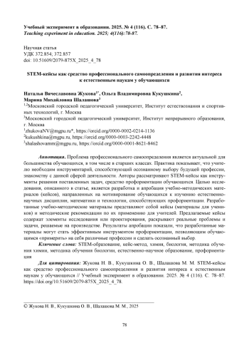 Проблема профессионального самоопределения является актуальной для большинства обучающихся, в том числе в старших классах. Практика показывает, что учителю необходим инструментарий, способствующий осознанному выбору будущей профессии, знакомству с данной сферой деятельности. Авторы рассматривают STEM-кейсы как инструменты решения поставленных задач, средство профориентации обучающихся. Целью исследования, описанного в статье, является разработка и апробация учебно-методических материалов (кейсов), направленных на мотивирование обучающихся к изучению естественно-научных дисциплин, математики и технологии, способствующих профориентации. Разработанные учебно-методические материалы представляют собой кейсы (материалы для учеников) и методические рекомендации по их применению для учителей. Предлагаемые кейсы содержат элементы исследования или проектирования, раскрывают реальные проблемы и задачи, решаемые на производстве. Результаты апробации показали, что разработанные материалы могут стать эффективным инструментом профориентации, позволяющим обучающимся «примерить» на себя различные профессии и сделать осознанный выбор.
