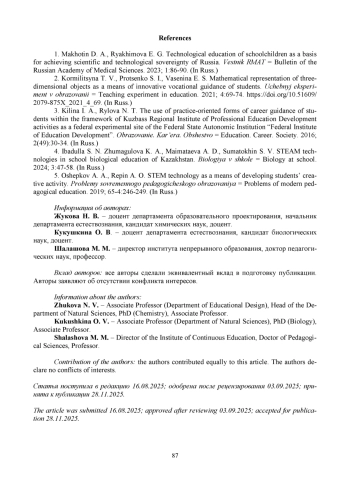 1. Махотин Д. А., Ряхимова Е. Г. Технологическое образование школьников как базис для достижения научного и технологического суверенитета России // Вестник РМАТ. 2023. № 1. С. 86-90. EDN: EVEFIV