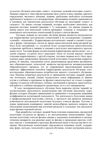 Методика обучения физике является базовой профессиональной дисциплиной для подготовки будущего учителя физики. Компетенции, формируемые в рамках данной дисциплины, можно назвать методическими. Применение тестовых заданий по данной дисциплине открывает возможности: оценочные - выявление качества и результативности образовательного процесса по методике обучения физике; прогностические - выявление потенциальных возможностей корректировки и развития образовательного процесса; конструктивные - повышение эффективности взаимодействия преподавателя со студентами; саморазвития - познание студентом своих возможностей, создание условий саморазвития; повышения качества учебных достижений студентов. В статье описаны подходы к конструированию тестовых заданий по методике обучения физике, приведены примеры и результаты оценки их когнитивной посильности для студентов в рамках самостоятельной внеаудиторной работы. Накопленный автором банк заданий применялся в качестве тренажера для корректировки методических компетенций будущих учителей физики, итоговый результат по каждому тесту учитывался в балльно-рейтинговой системе оценки по дисциплине.