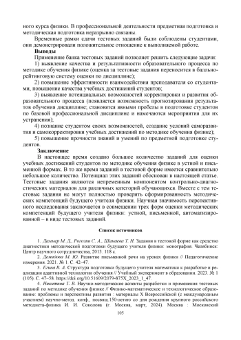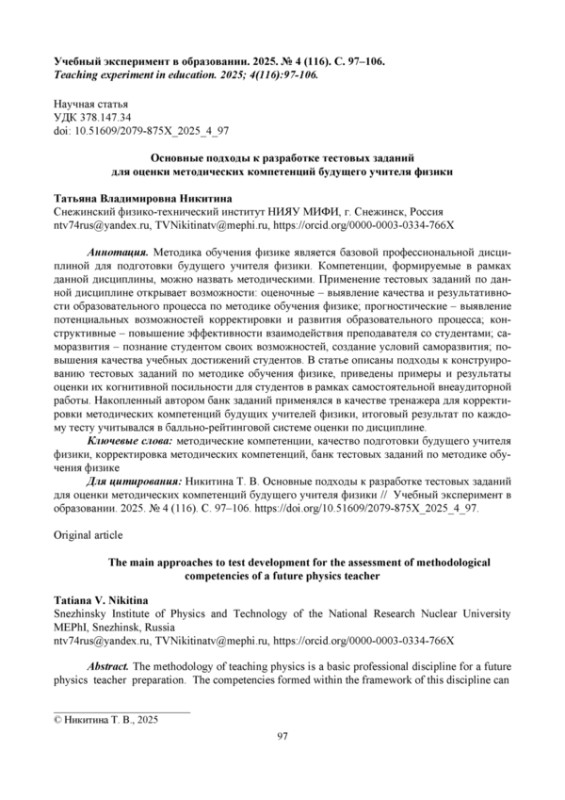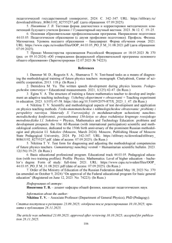 4. Никитина Т. В. Научно-методические аспекты разработки и применения тестовых заданий по методике обучения физике // Физико-математическое и технологическое образование: проблемы и перспективы развития: материалы X Всероссийской (с международным участием) научно-метод. конф., посвящ.150-летию со дня рождения крупного российского методиста-физика И. И. Соколова (г. Москва, март, 2024). Москва: Московский педагогический государственный университет, 2024. С. 342-347. URL: https://elibrary.ru/download/elibrary_80863192_82755257.pdf (дата обращения: 07.09.2025).