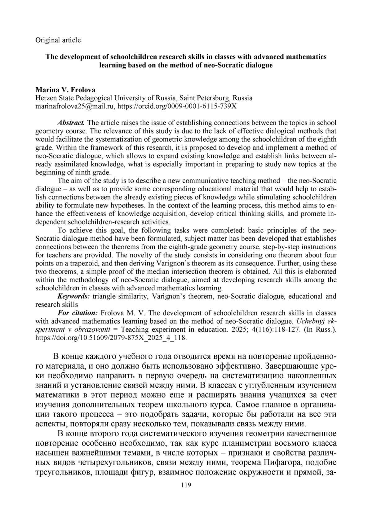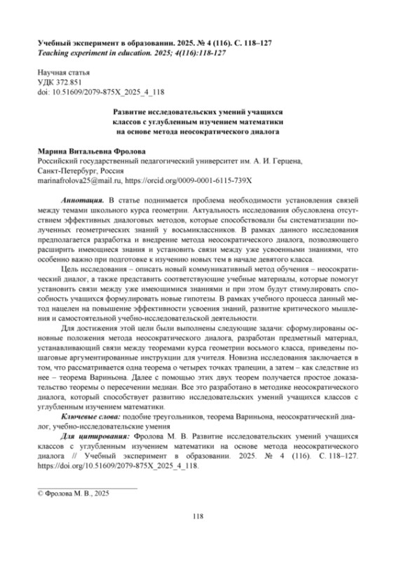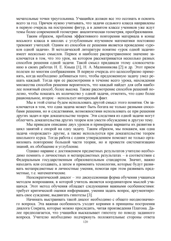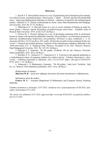 3. Фролова М. В. Сократический диалог как способ формирования навыков рассуждения на уроках стереометрии в классах с углубленным изучением математики // Классическая и современная геометрия: материалы международной конференции, посвященной 100-летию со дня рождения Л. С. Атанасяна, Москва, 01-04 ноября 2021 года. Москва: Московский педагогический государственный университет, 2021. С. 149-150. EDN: LRKTTC