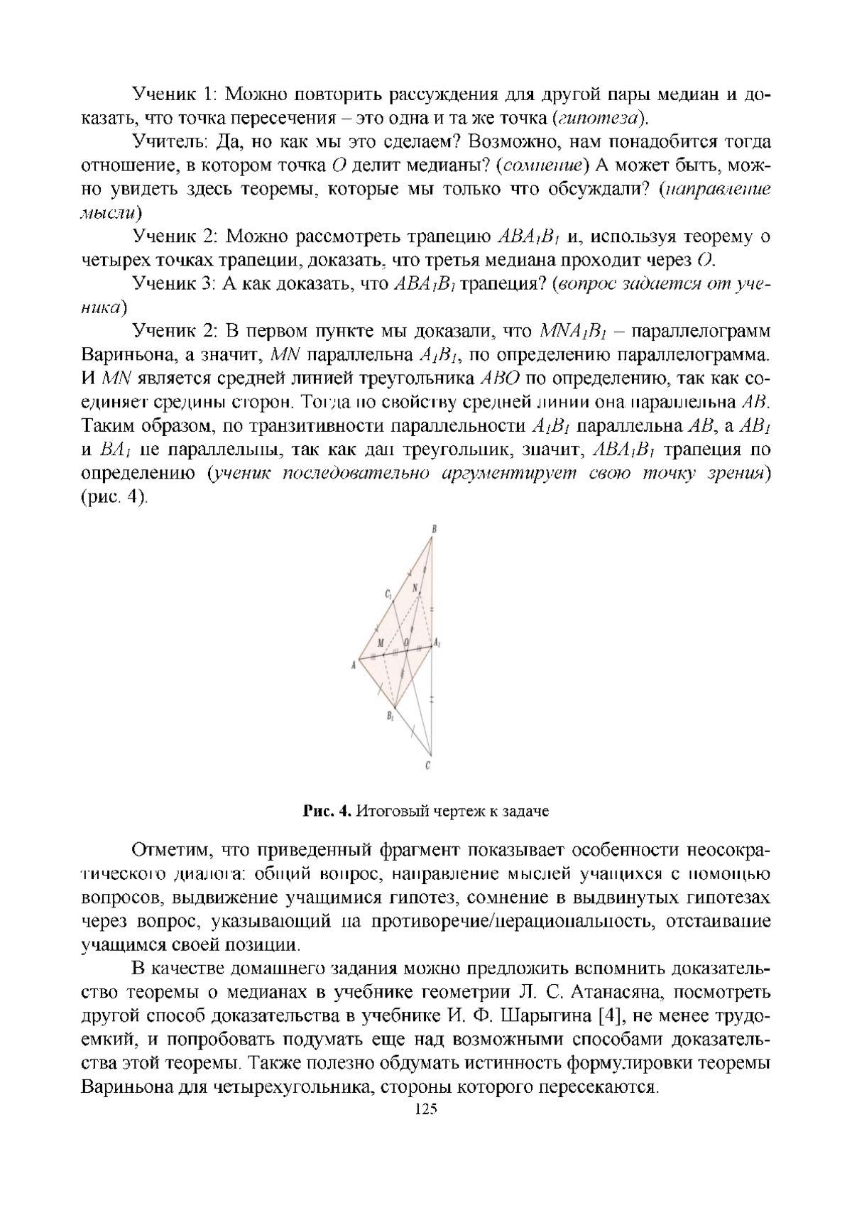 Для достижения этой цели были выполнены следующие задачи: сформулированы основные положения метода неосократического диалога, разработан предметный материал, устанавливающий связи между теоремами курса геометрии восьмого класса, приведены пошаговые аргументированные инструкции для учителя. Новизна исследования заключается в том, что рассматривается одна теорема о четырех точках трапеции, а затем - как следствие из нее - теорема Вариньона. Далее с помощью этих двух теорем получается простое доказательство теоремы о пересечении медиан. Все это разработано в методике неосократического диалога, который способствует развитию исследовательских умений учащихся классов с углубленным изучением математики.