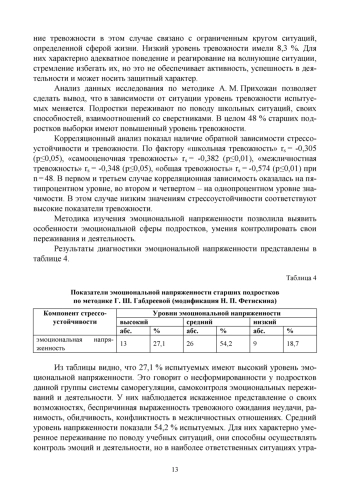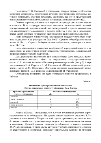 В статье представлены результаты исследования стрессоустойчивости и ее структурных компонентов у старших подростков. Обоснована актуальность и осуществлен теоретический анализ проблемы, проведено опытно-экспериментальное исследование компонентов стрессоустойчивости старших подростков. В процессе анализа результатов исследования выявлен недостаточно высокий уровень развития стрессоустойчивости подростков, обнаружена прямая и обратная корреляционная связь стрессоустойчивости и стратегий копинг-поведения, тревожности, эмоциональной напряженности. Результаты показали, что недостаточно адаптивные стратегии поведения, высокий уровень тревожности и эмоциональной напряженности обуславливают низкий уровень стрессоустойчивости, что говорит о целесообразности ее комплексного развития у старших подростков.