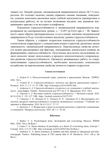 2. Усатов И. А. Стрессоустойчивость личности как фактор преодоления стресса // Концепт. 2016. Т. 2. С. 21-25. URL: http://e-koncept.ru/2016/46005.htm.