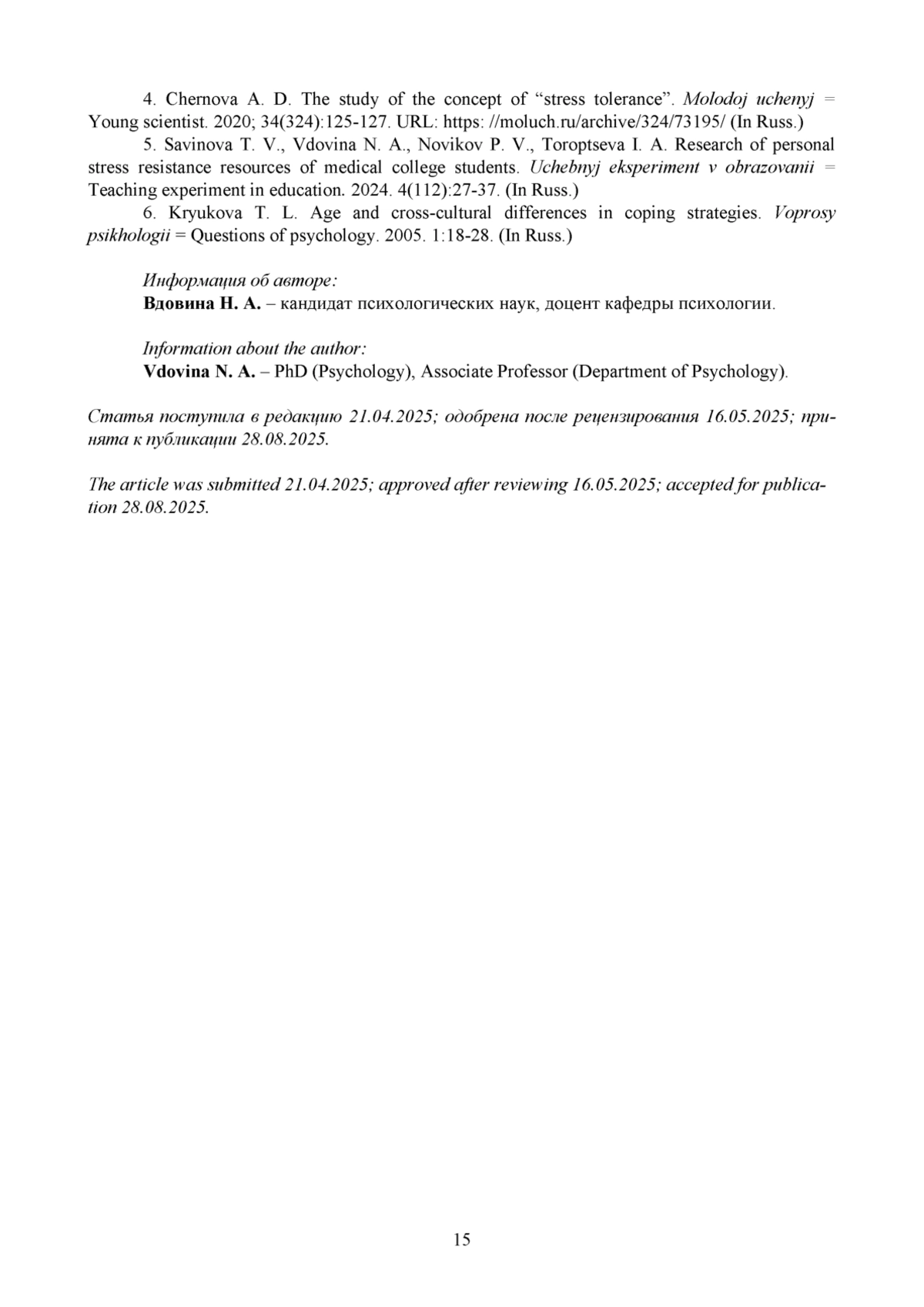 5. Савинова Т. В., Вдовина Н. А., Новиков П. В., Торопцева И. А. Исследование личностных ресурсов стрессоустойчивости студентов медицинского колледжа // Учебный эксперимент в образовании. 2024. № 4 (112). С. 27-37. EDN: ZFUTWB