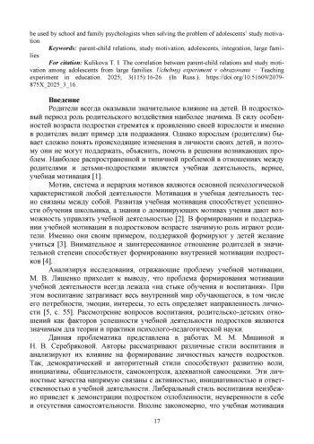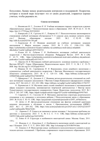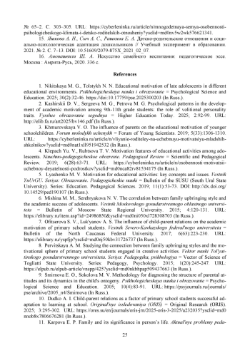 1. Никитская М. Г., Толстых Н. Н. Учебная мотивация старших подростков в разных образовательных средах // Психологическая наука и образование. 2025. № 30 (2). С. 32-46. http://elibDOI: 10.17759/pse.2025300203