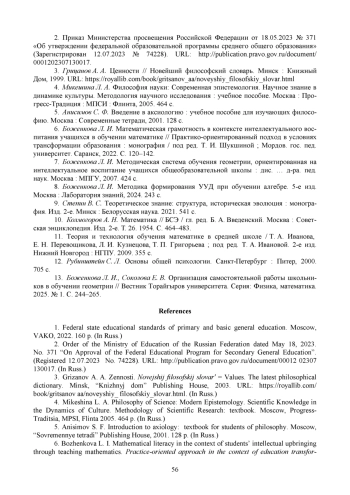 6. Боженкова Л. И. Математическая грамотность в контексте интеллектуального воспитания учащихся в обучении математике // Практико-ориентированный подход в условиях трансформации образования: монография / под ред. Т. И. Шукшиной; Мордов. гос. пед. университет. Саранск, 2022. С. 120-142. EDN: WAJLFE