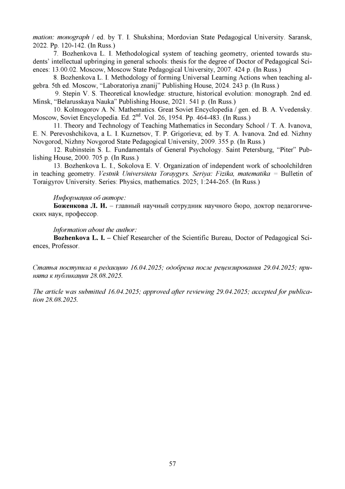 13. Боженкова Л. И., Соколова Е. В. Организация самостоятельной работы школьников в обучении геометрии // Вестник Торайгыров университета. Серия: Физика, математика. 2025. № 1. С. 244-265.