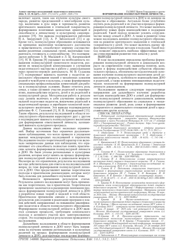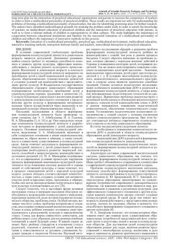 Целью статьи является изучение проблемы формирования поликультурной личности в дошкольном возрасте и определение влияния инновационных педагогических технологий на данный процесс. В статье приведены результаты анализа ключевых аспектов взаимодействия дошкольных образовательных организаций и родителей в контексте поликультурного образования. Методика исследования включала анализ и сравнение научных источников с ориентацией на ФГОС ДО и Концепцию дошкольного образования. Результатом исследования стал разработанный перспективный план по взаимодействию дошкольных образовательных организаций и родителей для повышения компетентности педагогов с целью формирования поликультурной личности детей дошкольного возраста. Данные результаты имеют важное значение не только для понимания проблем формирования поликультурной личности дошкольников, но и для выявления перспективных направлений дальнейших исследований. Авторами определены методологические основания для изучения исследуемой проблемы с целью обогащения знаний педагогов по поликультурному воспитанию детей дошкольного возраста и взаимодействию ДОО с родителями, а также для формирования толерантного отношения детей к представителям других культур. Исследование подчеркивает важность сотрудничества между образовательными учреждениями и семьями для успешного формирования поликультурной личности детей и отражает значимость инновационных методов в этом процесс.
