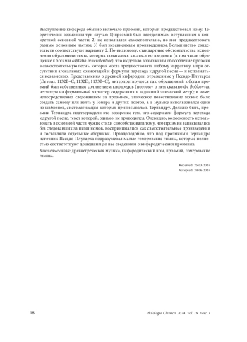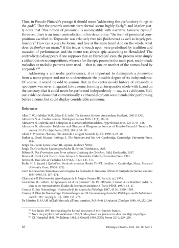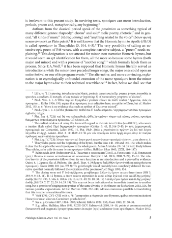 A citharodic performance typically included a προοίμιον that preceded a νόμος. Theoretically, there are three possible options: a prooimion (1) was an inseparable introduction to a specific main part; (2) was not performed independently, but could precede various main parts; (3) was an independent piece. Most evidence points to option 2. Standard circumstances of performance must have stereotyped the subject matter that appeared in the introduction, so the proem became an autonomous song that could precede any narrative part, and even be performed independently (if there were no agonistic connotations and transitional formulas). Pseudo-Plutarch’s notions of ancient citharody (De mus. 1132В–С; 1132D; 1133B–C) are interpreted as follows: a proem addressed to the gods was a citharode’s own composition (hence ὡς βούλονται, despite its formal character and epic metre). It was immediately followed by a nome, whose epic narration could be either original or taken from Homer and other poets and set to music according to one of melodic patterns systemized by Terpander. Terpander’s proems likely offered two proofs of this theory: they ended with a formula of transition to another song, which itself did not follow. Apparently, the option to use someone else’s poetry in the main body led to the practice of writing down the proems without the subsequent nomes, so that they were seen as independent works. It is likely that Pseudo-Plutarch’s source was referring to minor Homeric hymns, since they correspond perfectly with the information that we have about citharodic proems