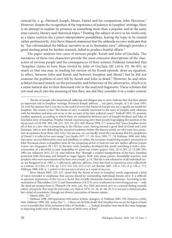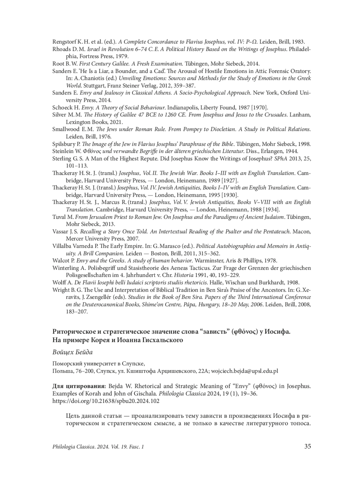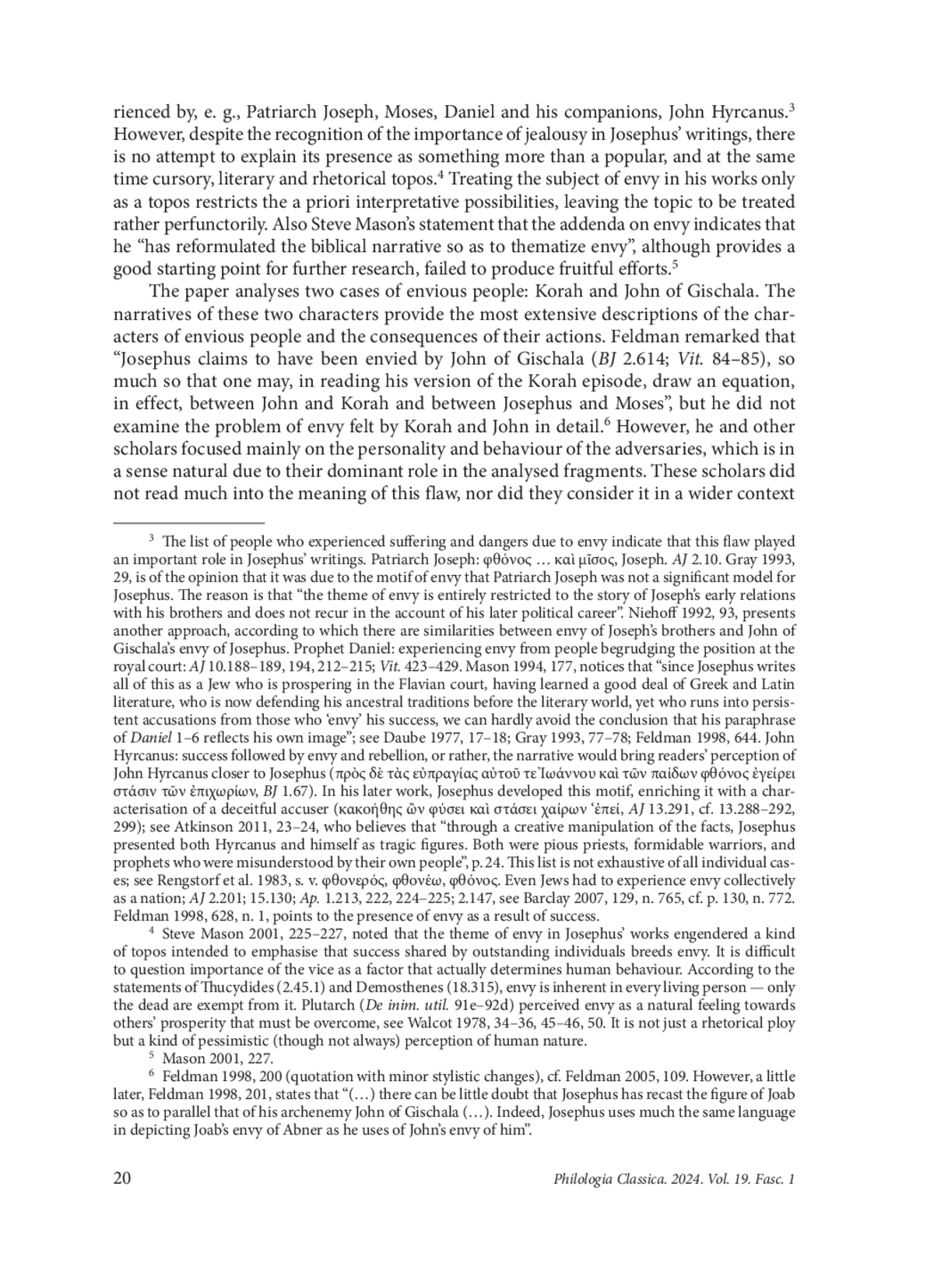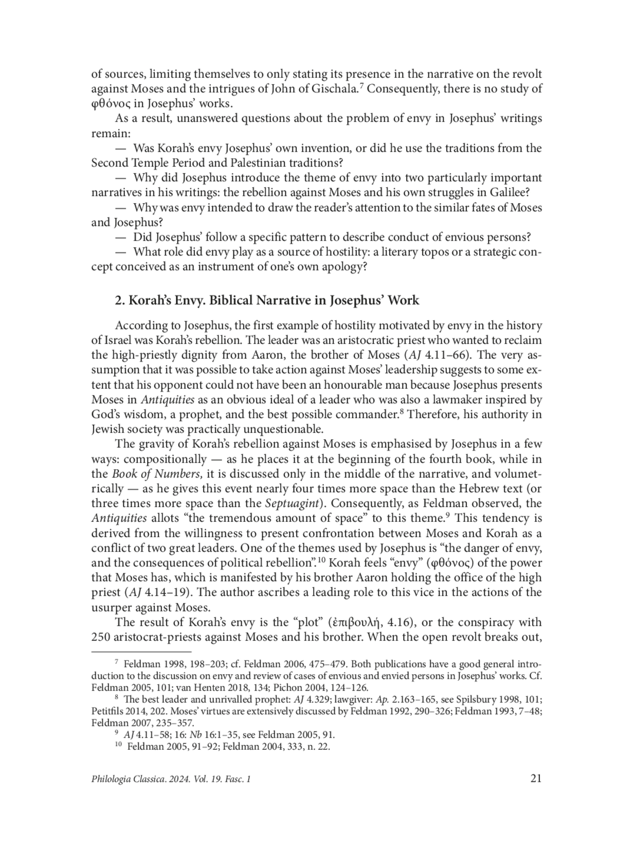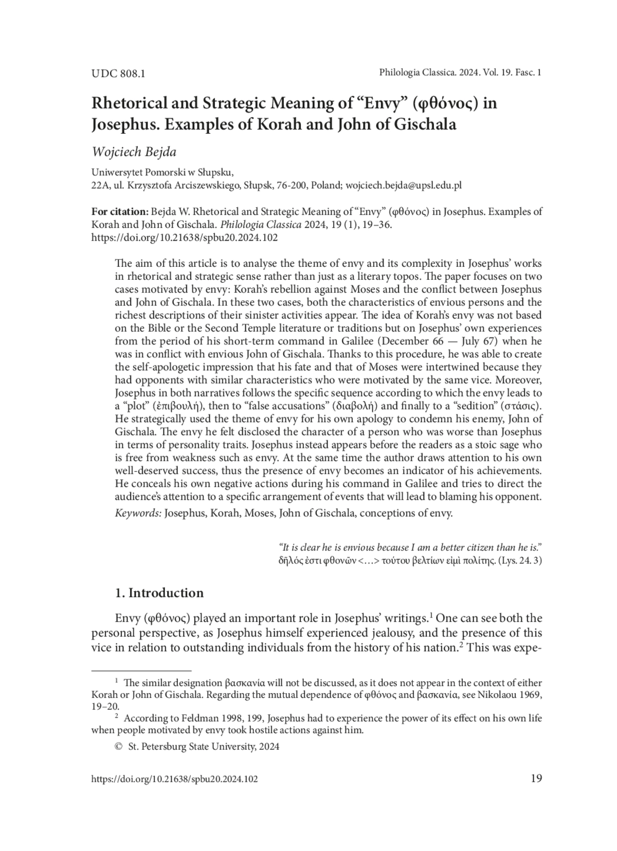 Envy (φθόνος) played an important role in Josephus’ writings. 1 One can see both the personal perspective, as Josephus himself experienced jealousy, and the presence of this vice in relation to outstanding individuals from the history of his nation.2 This was experienced by, e. g., Patriarch Joseph, Moses, Daniel and his companions, John Hyrcanus.3 However, despite the recognition of the importance of jealousy in Josephus’ writings, there is no attempt to explain its presence as something more than a popular, and at the same time cursory, literary and rhetorical topos.4 Treating the subject of envy in his works only as a topos restricts the a priori interpretative possibilities, leaving the topic to be treated rather perfunctorily. Also Steve Mason’s statement that the addenda on envy indicates that he “has reformulated the biblical narrative so as to thematize envy”, although provides a good starting point for further research, failed to produce fruitful efforts