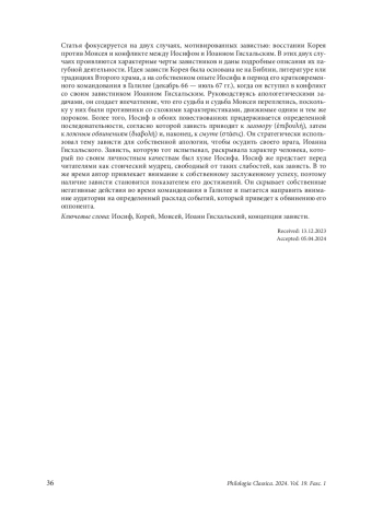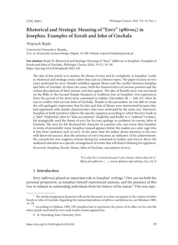 The aim of this article is to analyse the theme of envy and its complexity in Josephus’ works in rhetorical and strategic sense rather than just as a literary topos. The paper focuses on two cases motivated by envy: Korah’s rebellion against Moses and the conflict between Josephus and John of Gischala. In these two cases, both the characteristics of envious persons and the richest descriptions of their sinister activities appear. The idea of Korah’s envy was not based on the Bible or the Second Temple literature or traditions but on Josephus’ own experiences from the period of his short-term command in Galilee (December 66 — July 67) when he was in conflict with envious John of Gischala. Thanks to this procedure, he was able to create the self-apologetic impression that his fate and that of Moses were intertwined because they had opponents with similar characteristics who were motivated by the same vice. Moreover, Josephus in both narratives follows the specific sequence according to which the envy leads to a “plot” (ἐπιβουλή), then to “false accusations” (διαβολή) and finally to a “sedition” (στάσις). He strategically used the theme of envy for his own apology to condemn his enemy, John of Gischala. The envy he felt disclosed the character of a person who was worse than Josephus in terms of personality traits. Josephus instead appears before the readers as a stoic sage who is free from weakness such as envy. At the same time the author draws attention to his own well-deserved success, thus the presence of envy becomes an indicator of his achievements. He conceals his own negative actions during his command in Galilee and tries to direct the audience’s attention to a specific arrangement of events that will lead to blaming his opponent. Keywords: Josephus, Korah, Moses, John of Gischala, conceptions of envy