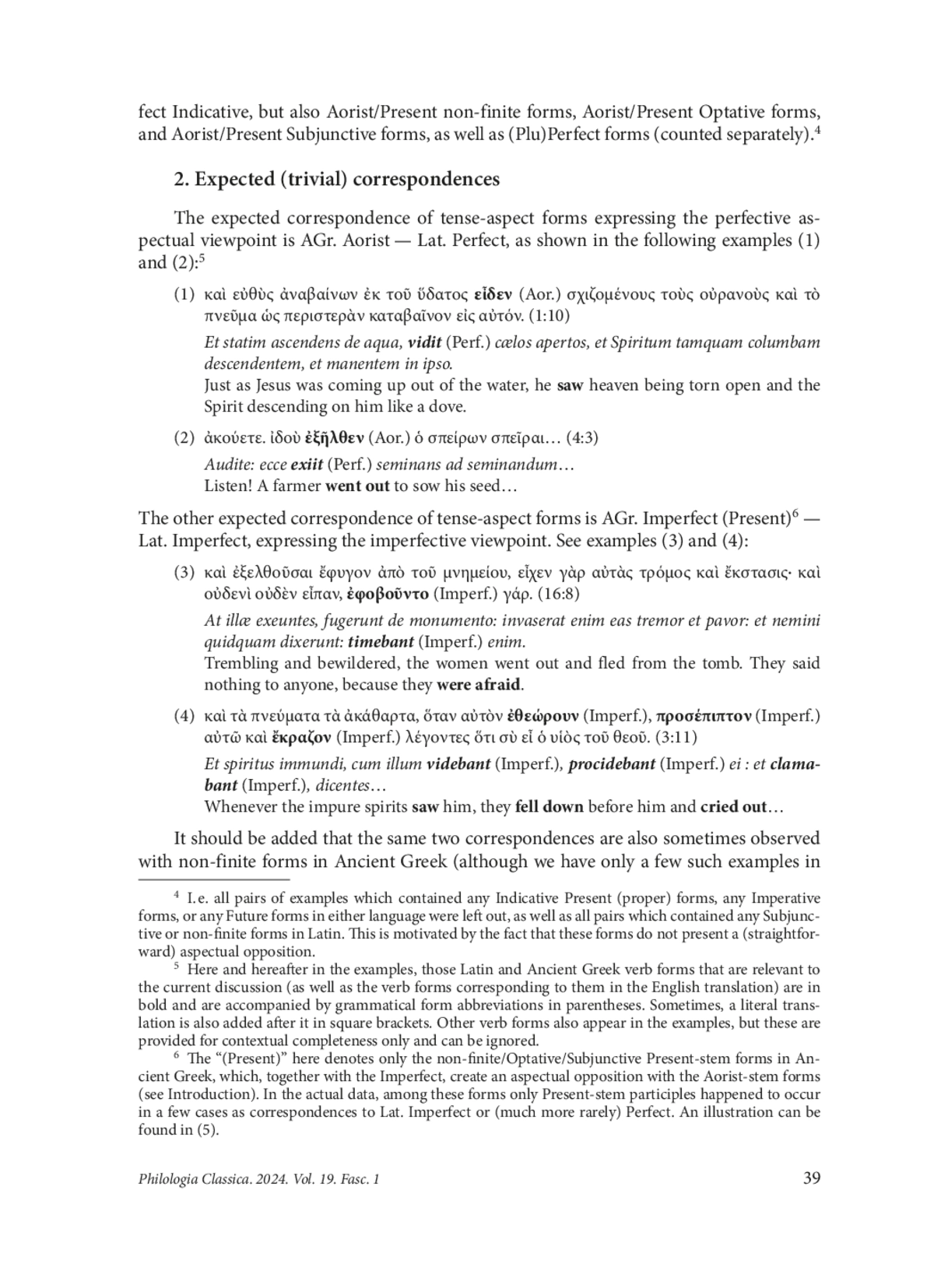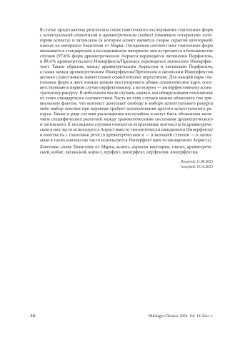 The paper presents the results of a comparative study of verb forms with aspectual semantics in Ancient Greek (Koine) (which has an overt separate category of aspect) and Latin (where aspect is rather a covert category), based on the Gospel of Mark. For the Ancient Greek original (ca 70 CE), the Nestle-Aland 26th/27th edition (Greek New Testament) was used; for the Latin translation, the Clementine Vulgate edition (ca 420 CE, Vulgata Clementina). Additionally, a contemporary English translation — the New International Version (Holy Bible NIV) — was used as an auxiliary translation. The study involved identifying and analyzing parallel verb forms (those that enter aspectual oppositions) in the Ancient Greek and Latin translations.