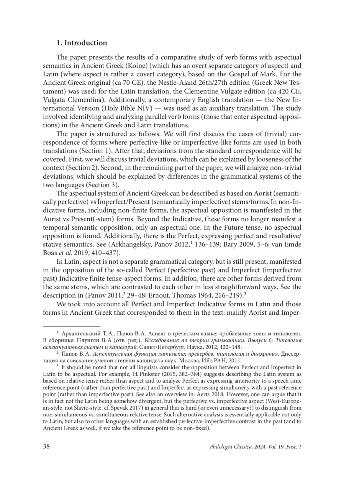 5. Arkhangelsky T. A., Panov V. A. Aspect in Greek: Problematic Areas and Typology. In: V. A. Plungian (ed.). Studies in the Theory of Grammar. Part 6: Typology of Aspectual Systems and Categories. St Petersburg, Nauka Publ., 2012, 122-148 (in Russian).