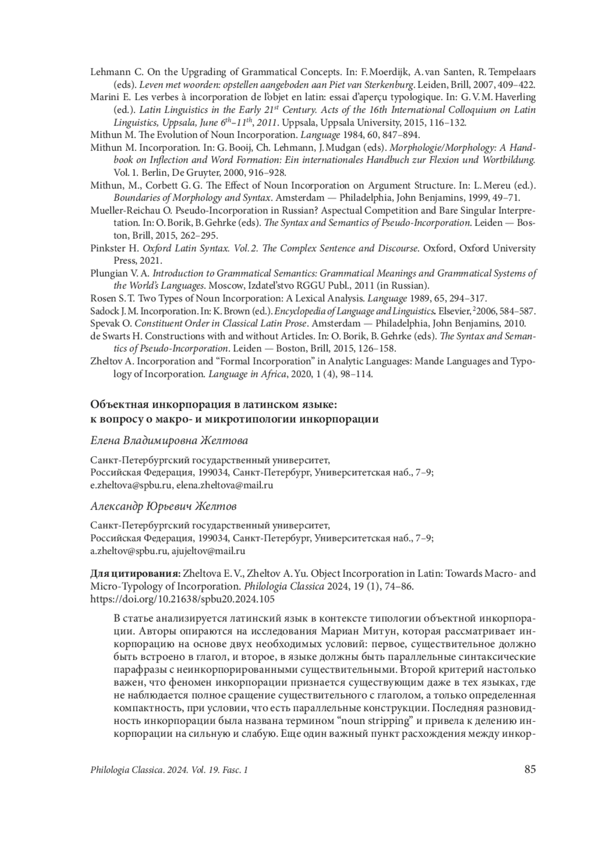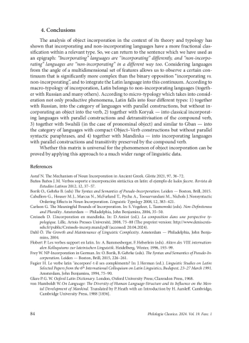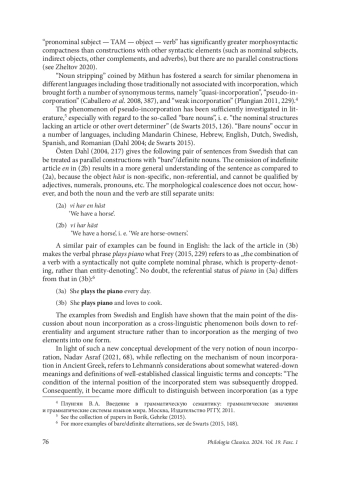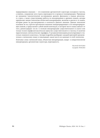 In this paper, the Latin language is analyzed in the context of typology of object incorporation. The authors draw on the research of Mithun, who considers incorporation on the basis of two obligatory conditions: first, the noun must be embedded in the verb, and second, the language must have parallel syntactic paraphrases with non-incorporated noun. The second criterion is so important that the phenomenon of incorporation is acknowledged to exist even in those languages where there is no complete integration of the noun into the verb, but only a certain syntactic compactness, provided there are parallel constructions. The latter type has been coined “noun stripping” and has launched the division of incorporation into two types, viz. “strong” and “weak” incorporation. Another important point of divergence between the incorporating languages is the change of the argument structure of the source verb, namely, the preservation or loss of transitivity of the incorporated complex. Taking all these parameters into account, the authors propose a new typology of object incorporation, including languages that have not previously been considered in the context of this phenomenon. This typology is not based on a strict opposition of incorporating and non-incorporating languages, but represents a kind of continuum in which the place of a language depends on whether it demonstrates: 1) full incorporation or only a close syntactic Noun–Verb compactness; 2) the presence of parallel syntactic paraphrases; 3) the detransitivisation of the resulting compound verb. The authors examine each criterion in detail as applied to Latin and show the place of Latin in this typology