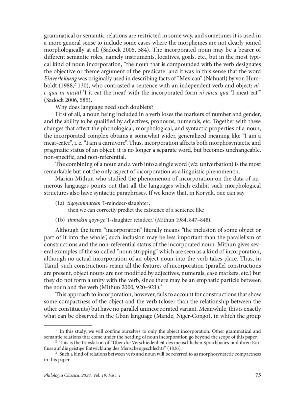 Incorporation is a grammatical phenomenon in which a word contains morphemes that are perceived as separate elements of a sentence. Sometimes the term is used in a narrower sense to refer only to cases where morphemes are joined by coalescence or where grammatical or semantic relations are restricted in some way, and sometimes it is used in a more general sense to include some cases where the morphemes are not clearly joined morphologically at all (Sadock 2006, 584). The incorporated noun may be a bearer of different semantic roles, namely instruments, locatives, goals, etc., but in the most typical kind of noun incorporation, “the noun that is compounded with the verb designates the objective or theme argument of the predicate1 and it was in this sense that the word Einverleibung was originally used in describing facts of “Mexican” (Nahuatl) by von Humboldt (1988, 2 130), who contrasted a sentence with an independent verb and object: nic-qua in nacatl ‘I-it-eat the meat’ with the incorporated form ni-naca-qua ‘I-meat-eat’” (Sadock 2006, 585).