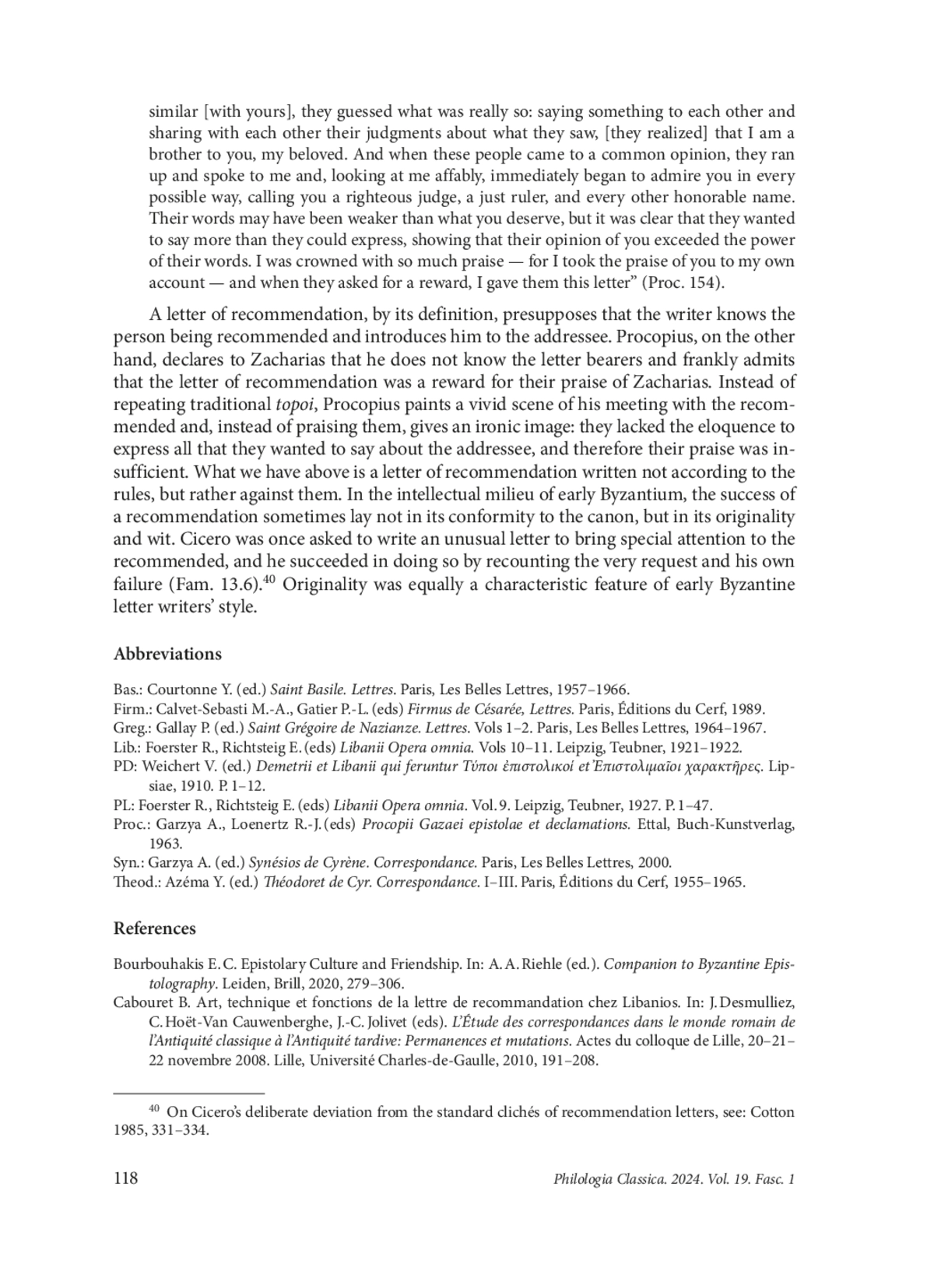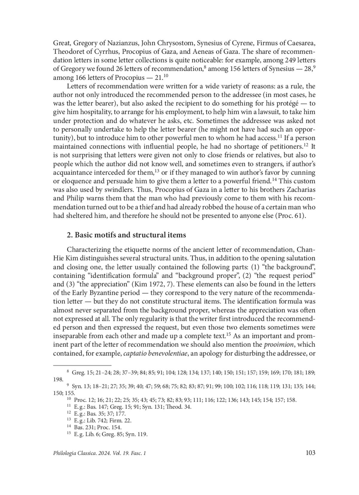 The letter of recommendation (ἡ συστατικὴ ἐπιστολή, litterae commendaticiae) was known in Antiquity as a separate genre form of letter writing, for which a certain set of compositional techniques, standard formulas and clichés was developed. This genre was widespread both in Greek and Latin epistolography: many examples of it have survived, both among business correspondence proper, which has survived on papyri, and among “literary” epistles, e. g., in Cicero’s epistolary collection. In Byzantium the letter of recommendation was also in great demand — it is not difficult to find letters of this type in the epistolary collections of many authors from the 4th to the 15th century. However, while ancient letters of recommendation are well studied,1 the etiquette of this genre in the Byzantine tradition has hardly been studied yet. In general, Byzantine epistolary etiquette2 is currently under active research. Byzantine letters of consolation were examined in detail (Σαρρής 2005), etiquette norms developed for praising a letter received, interpretation of a gift and other situations have been analyzed.3 Meanwhile, no special studies on the etiquette of letters of recommendation in Byzantium have been written yet. We can only point to scholarly works that examine letters of recommendation by individual authors, e. g., Libanius or Synesius of Cyrene, focusing on their style, motifs and functions.