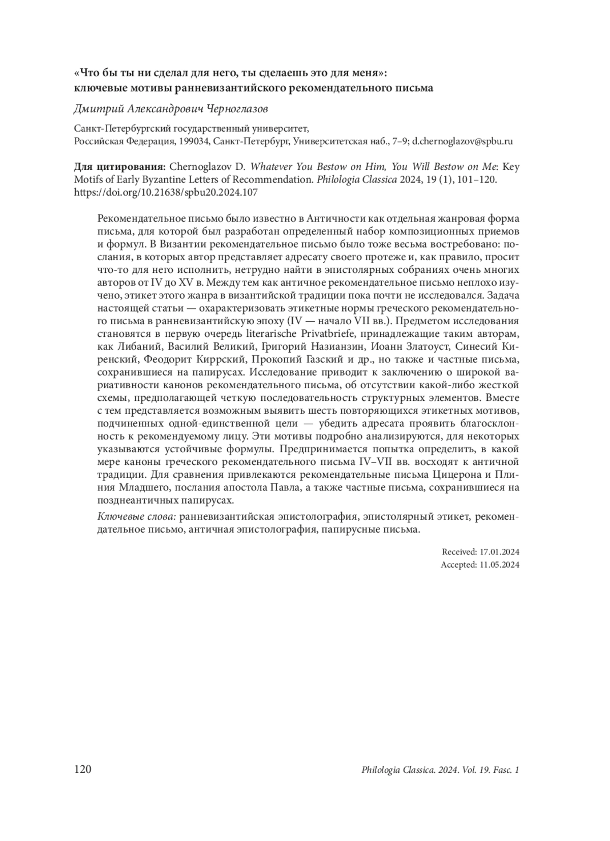 The letter of recommendation was known in Antiquity as a separate genre of letter writing for which a certain set of compositional techniques and formulae were developed. In Byzantium, too, the letter of recommendation was in great demand: letters in which the author presents his protégé to the addressee and, as a rule, asks him to perform something for him are not difficult to find in the epistolary collections of many authors from the 4th to the 15 th century. Meanwhile, while the ancient letter of recommendation is well studied, the etiquette of this genre in the Byzantine tradition has hardly been investigated yet. The purpose of this piece is to characterize the etiquette norms of Greek letter of recommendation in the early Byzantine period (4th — early 7th centuries). The subject of the study are, first of all, literarische Privatbriefe, belonging to Libanius, Basil the Great, Gregory of Nazianzus, John Chrysostom, Synesius of Cyrene, Theodoret of Cyrrhus, Procopius of Gaza and others, but also private papyrus letters. Their analysis leads to the conclusion that there is a wide variability of the canons of the letter of recommendation, the absence of any rigid scheme that presupposes a clear sequence of structural elements. At the same time, it reveals six recurrent etiquette motifs, all of which are subordinated to a single goal — to persuade the addressee to patronize the recommended person. These motifs are analyzed in detail, and stable formulas are indicated for some of them. An attempt is made to determine to what extent the canons of Greek letters of recommendation of the 4 th–7th centuries go back to the ancient tradition. The letters of recommendation of Cicero and Pliny the Younger, as well as letters preserved on late antique papyri, are used as material for comparative analysis