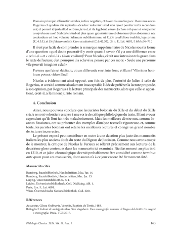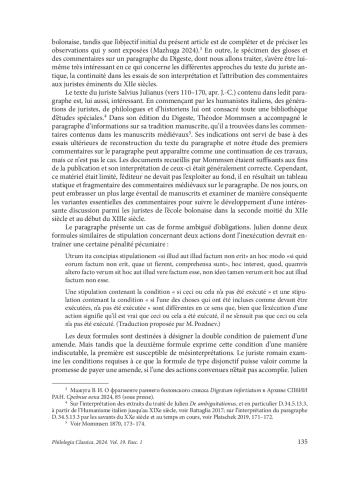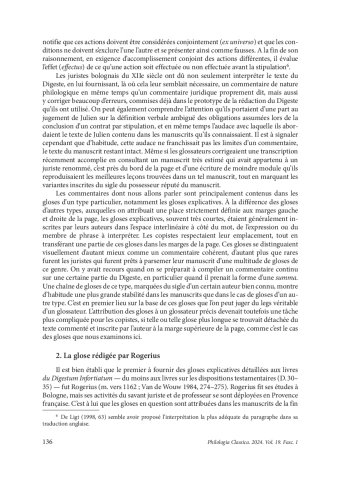L’idée de cet article est née au cours des recherches sur le fragment du Digestum Infortiatum1 conservé dans les Archives scientifiques de l’Institut d’histoire de Saint-Pétersbourg (l’Académie des sciences de Russie).2 Un article parallèle présente une analyse comparative du texte du Digeste et des gloses de différents types, dans ce fragment et dans d’autres manuscrits du XIIe et du début du XIIIe siècles principalement d’origine bolonaise, tandis que l’objectif initial du présent article est de compléter et de préciser les observations qui y sont exposées (Mazhuga 2024).3 En outre, le spécimen des gloses et des commentaires sur un paragraphe du Digeste, dont nous allons traiter, s’avère être luimême très intéressant en ce qui concerne les différentes approches du texte du juriste antique, la continuité dans les essais de son interprétation et l’attribution des commentaires aux juristes éminents du XIIe siècles