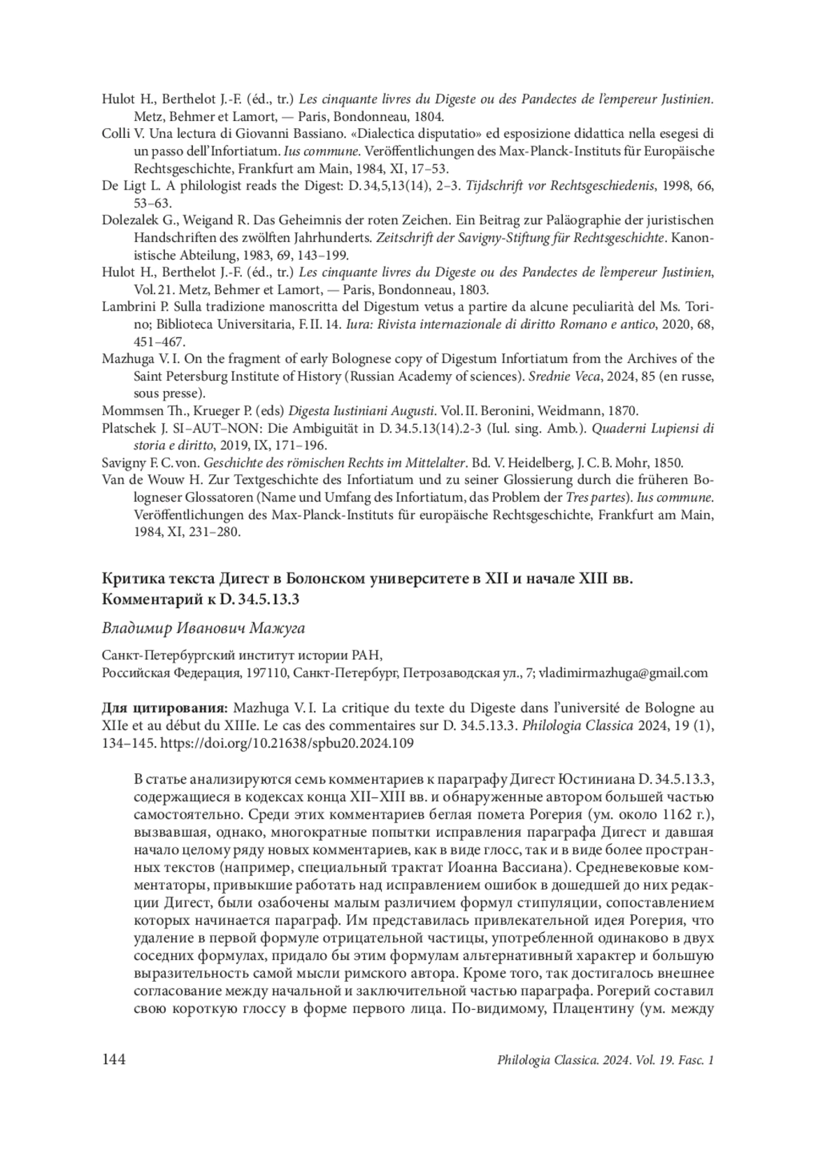 15. Mazhuga V. I. On the fragment of early Bolognese copy of Digestum Infortiatum from the Archives of the Saint Petersburg Institute of History (Russian Academy of sciences). Srednie Veca, 2024, 85 (en russe, sous presse).