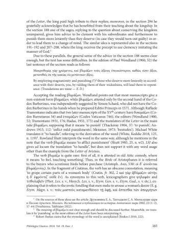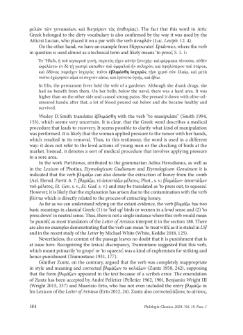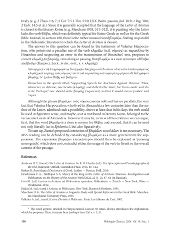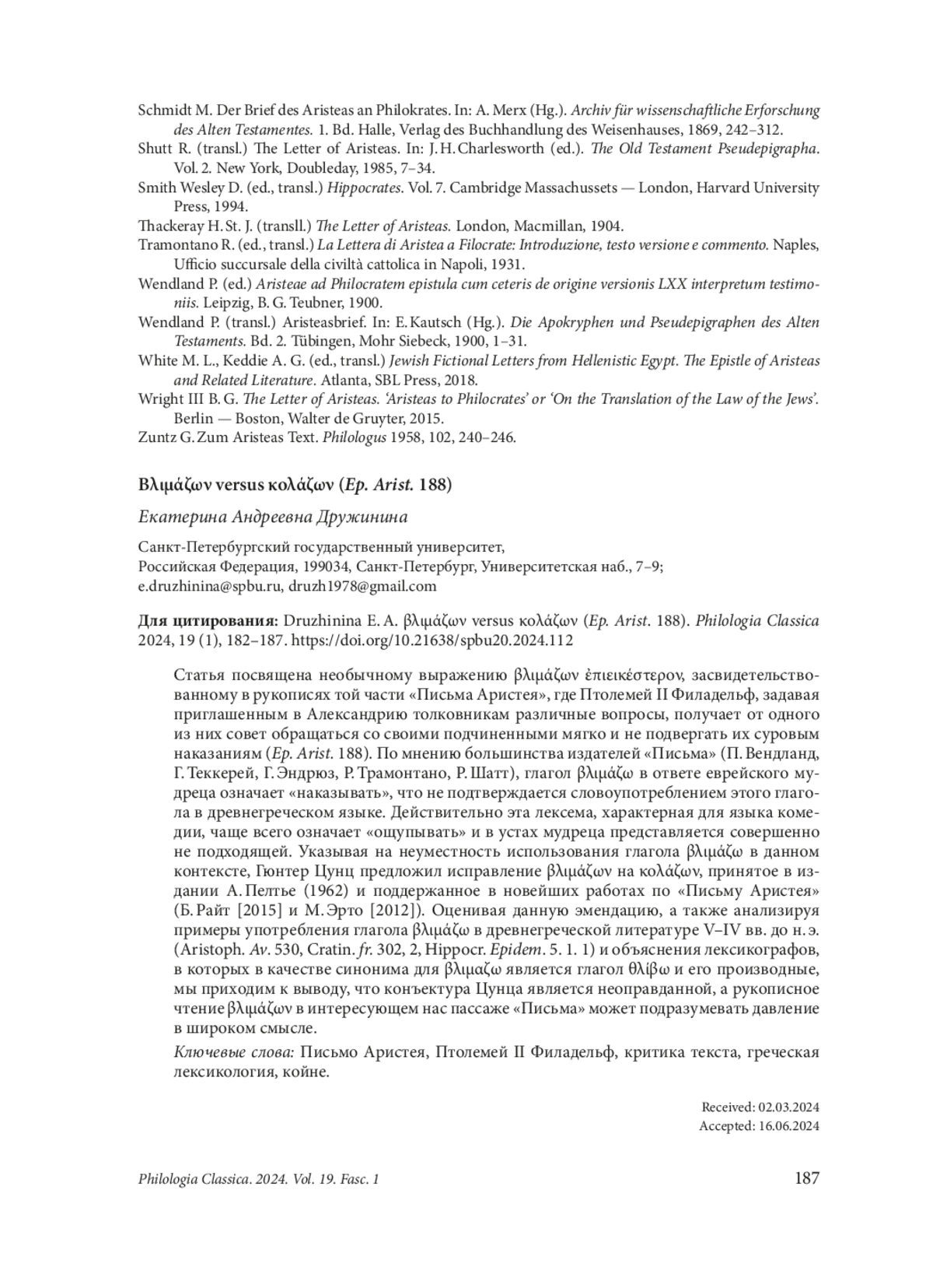 This piece explores the difficult expression βλιμάζων ἐπιεικέστερον found in the MSS of the Letter of Aristeas, in the section describing how Ptolemy II Philadelphus puts questions to the interpreters he has invited in Alexandria and receives advice to treat his subordinates with kindness and not to impose harsh punishments on them (Ep. Arist. 188). According to the most scholars, who have published the Letter of Aristeas, including P. Wendland, H. Thackeray, H. Andrews, R. Tramontano, and R. Shutt, the verb βλιμάζω in the answer of the Jewish sage means ‘to chastise’. However, this interpretation is not supported by the actual usage of the verb in ancient Greek. In fact, this word, which is often used in comedy, usually means ‘to grope’ and seems quite out of place coming from the sage. Günther Zuntz pointed out that the verb βλιμάζω is not appropriate and suggested correcting βλιμάζων to κολάζων, which is accepted by A. Pelletier (1962) and is supported in the recent studies on the Letter (Wright [2015] and Erto [2012]). The consideration of the correction and the analysis of the wordusage in ancient Greek literature, as well as the examination of the explanations provided by lexicographers, where the verb θλίβω and its derivatives are used as synonyms for βλιμάζω, lead us to the conclusion that Zuntz’s suggestion is not necessary und should be rejected. The reading βλιμάζων, confirmed by the manuscripts, may be retained by supposing that it implies pressure in a broader sense