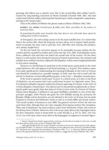 This piece explores the difficult expression βλιμάζων ἐπιεικέστερον found in the MSS of the Letter of Aristeas, in the section describing how Ptolemy II Philadelphus puts questions to the interpreters he has invited in Alexandria and receives advice to treat his subordinates with kindness and not to impose harsh punishments on them (Ep. Arist. 188). According to the most scholars, who have published the Letter of Aristeas, including P. Wendland, H. Thackeray, H. Andrews, R. Tramontano, and R. Shutt, the verb βλιμάζω in the answer of the Jewish sage means ‘to chastise’. However, this interpretation is not supported by the actual usage of the verb in ancient Greek. In fact, this word, which is often used in comedy, usually means ‘to grope’ and seems quite out of place coming from the sage. Günther Zuntz pointed out that the verb βλιμάζω is not appropriate and suggested correcting βλιμάζων to κολάζων, which is accepted by A. Pelletier (1962) and is supported in the recent studies on the Letter (Wright [2015] and Erto [2012]). The consideration of the correction and the analysis of the wordusage in ancient Greek literature, as well as the examination of the explanations provided by lexicographers, where the verb θλίβω and its derivatives are used as synonyms for βλιμάζω, lead us to the conclusion that Zuntz’s suggestion is not necessary und should be rejected. The reading βλιμάζων, confirmed by the manuscripts, may be retained by supposing that it implies pressure in a broader sense