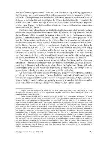 This article is originally a chapter of my PhD dissertation, written during my being a postgraduate student at the University of Bar-Ilan (Ramat Gan, Israel, 2019–2022). 1 In this paper, I am going to analyze the relationship between Sophocles’ Antigone and Aeschylus’ extant Septem contra Thebes and lost Eleusinians. My working hypothesis is that Sophocles uses references and hints to his predecessor’s works in order to create expectations of the spectators which afterwards prove false. Moreover, while the situation of Antigone is radically different from that of the Septem, the latter tragedy — or rather, the whole Aeschylean Theban tetralogy of which we have only this one and several fragments of other three dramas — with its worldview is given a voice in the Sophocles’ tragedy, and it is the voice of the Chorus