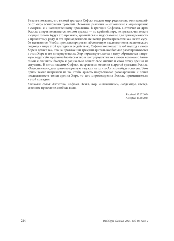 This paper is dedicated to the analysis of the intertextual relationship between Sophocles’ Antigone and the plays of Aeschylus, especially the Theban trilogy. It is shown that Sophocles in this play creates the situation that is radically different from that of Aeschylus’ tragedies. The main differences are the attitude towards “peace in death” and towards the ancestral curse. In Sophoclean play, by contrast with Aeschylus, death is not the end of the strife — at least not until those in power acknowledge that it is; blood ties are not enough for belonging to the cursed family, and this belonging is not necessarily envisaged in negative terms. To illustrate the utter inadequacy of the Aeschylean approach to the world and the events of his tragedy, Sophocles embodies such approach in his Chorus and provokes, during the course of the play, the growing disappointment of the spectator by it. The Chorus is irresponsive when directly addressed, annoyingly counterproductive during the commos with Antigone and prone to change their opinion and perspective too quickly and radically. At the fifth stasimon Sophocles, by the reference to another Aeschylus’ tragedy, this time the Eleusinians, gives the spectator the short-living hope for the rescue of Antigone. This trap is also intended to disappoint the spectators and show them the inadequacy of the Chorus’ Aeschylean perspective