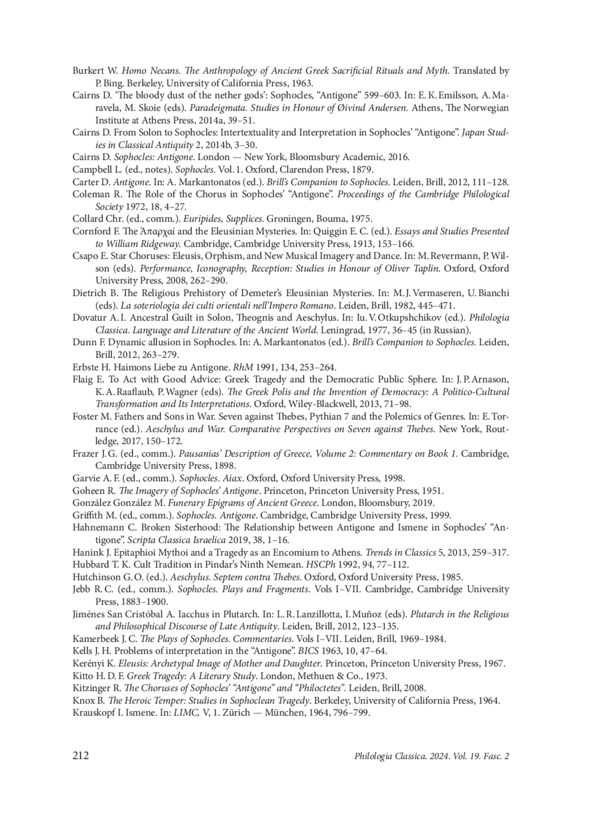 12. Cairns D. From Solon to Sophocles: Intertextuality and Interpretation in Sophocles’ “Antigone”. Japan Studies in Classical Antiquity 2, 2014b, 3-30.