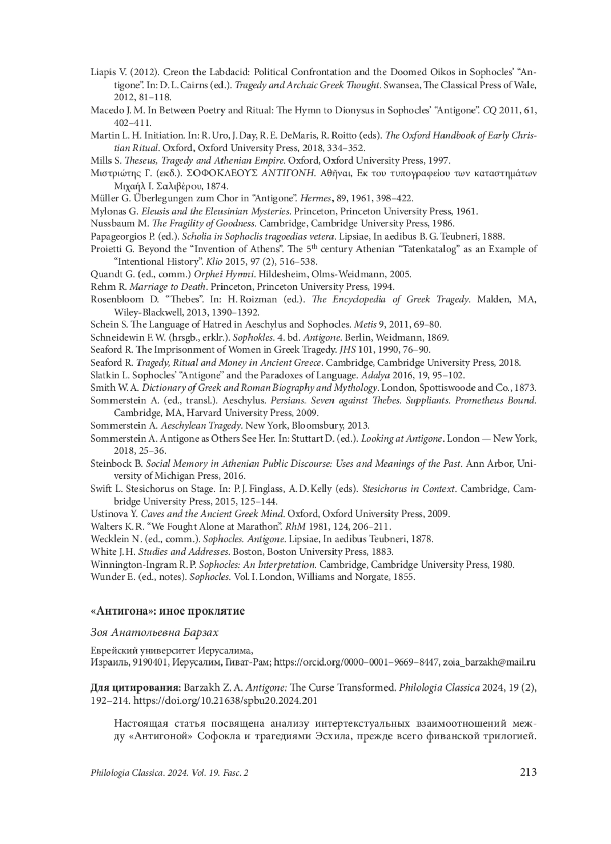 1. Barzakh Z. Soph. Ant. 471 and Aeschylus’ Oedipus. Philologia Classica 2017, 12 (1), 4-11. EDN: ZRKJRV